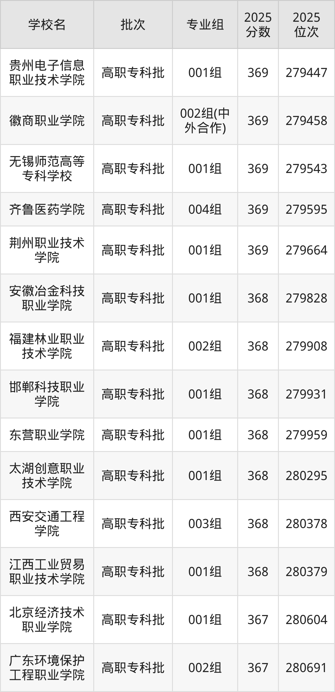 2025年安徽高考物理类368分(279728名~280384名)能上的大学有东营职业学院001组、福建林业职业技术学院002组、邯郸科技职业学院001组、江西工业贸易职业技术学院001组等。