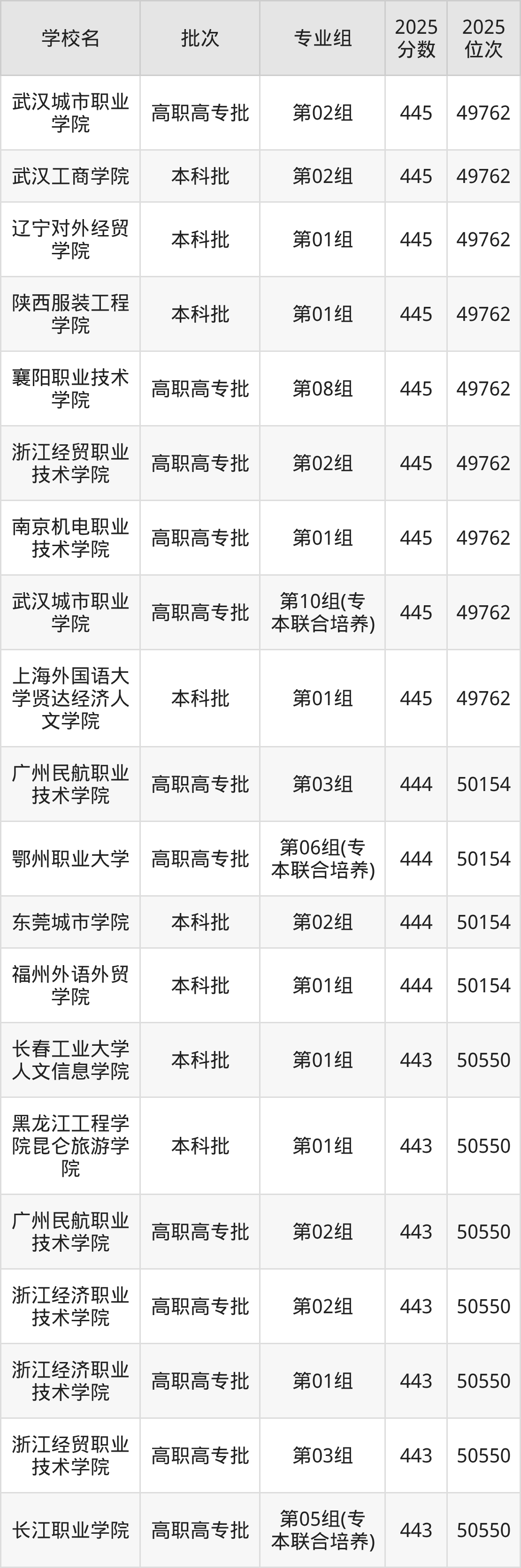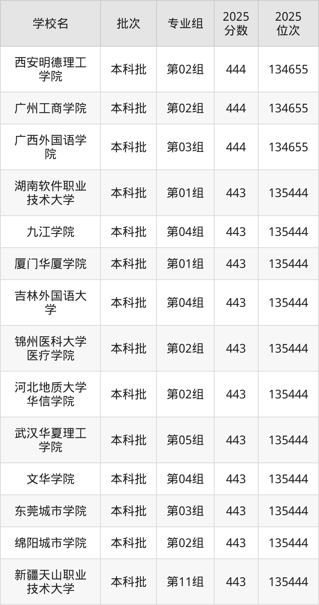 2025年湖北高考物理类443分(134656名~135444名)能上的大学有文华学院第04组、武汉华夏理工学院第05组、河北地质大学华信学院第02组、锦州医科大学医疗学院第02组等。