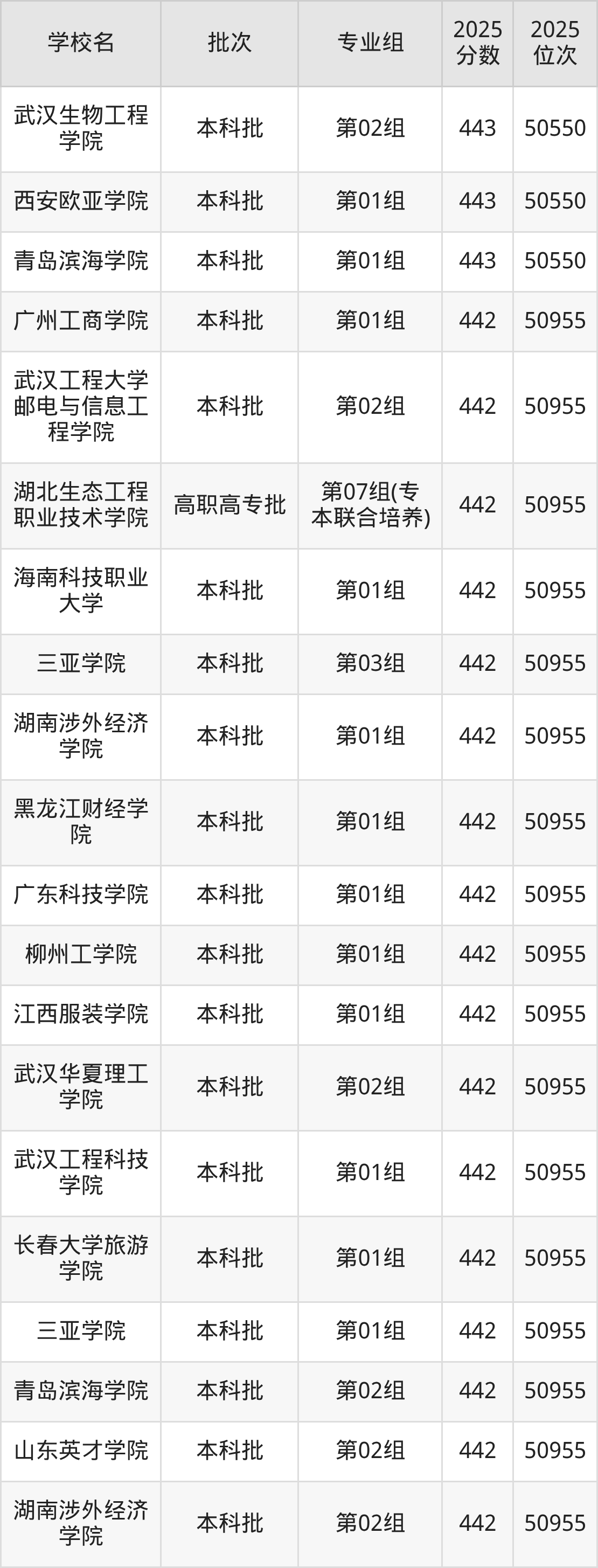 2025年湖北高考历史类443分(50155名~50550名)能上的大学有武汉生物工程学院第02组、长春工业大学人文信息学院第01组、黑龙江工程学院昆仑旅游学院第01组、青岛滨海学院第01组等。