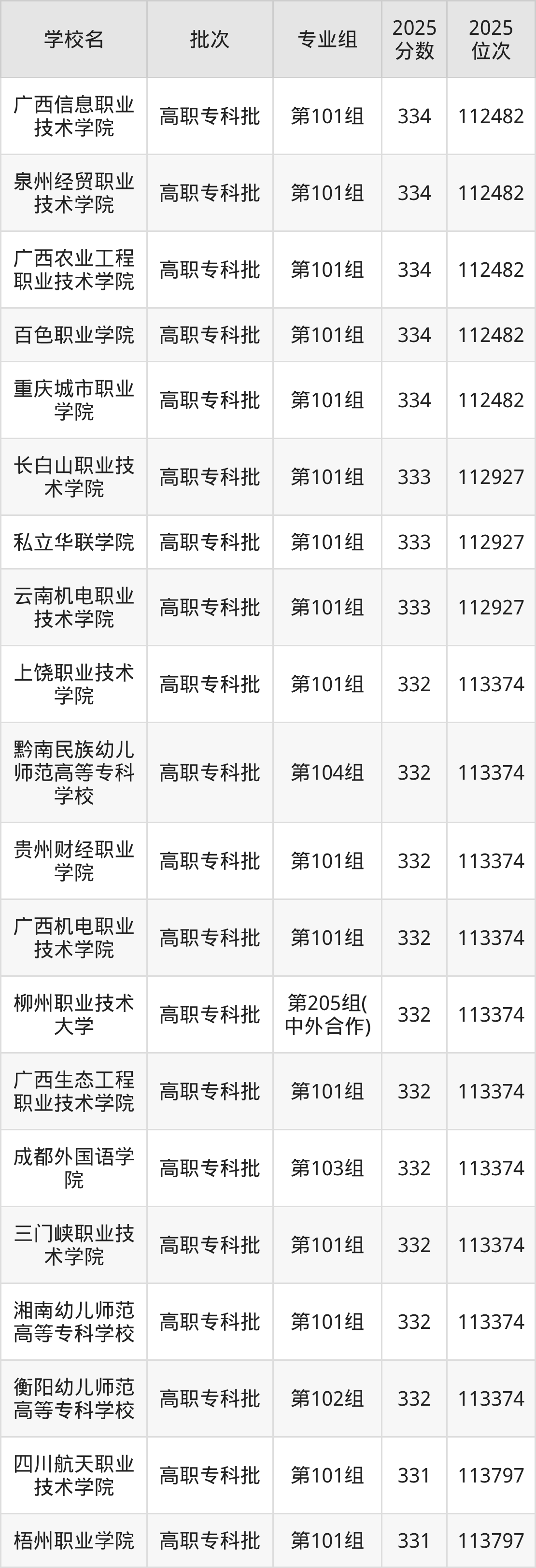 2025年湖南高考历史类332分(112928名~113374名)能上的大学有上饶职业技术学院第101组、广西机电职业技术学院第101组、柳州职业技术大学第205组(中外合作)、广西生态工程职业技术学院第101组等。