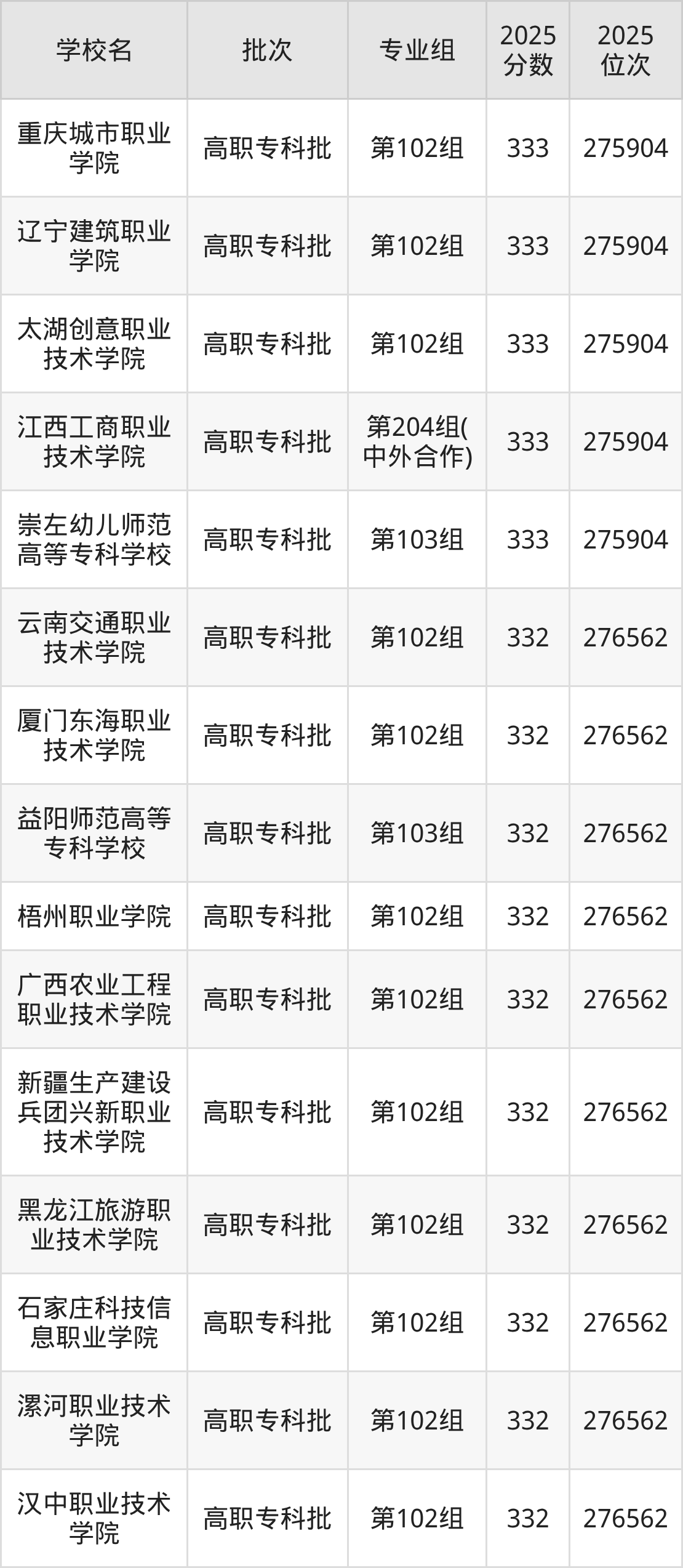 2025年湖南高考物理类332分(275905名~276562名)能上的大学有石家庄科技信息职业学院第102组、黑龙江旅游职业技术学院第102组、厦门东海职业技术学院第102组、广西农业工程职业技术学院第102组等。