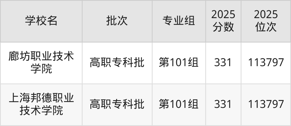 另外录取位次低于该区间(较稳妥)的有四川航天职业技术学院第101组(113797名)、廊坊职业技术学院第101组(113797名)等;录取位次高于该区间(可冲)的有私立华联学院第101组(112927名)、长白山职业技术学院第101组(112927名)等。