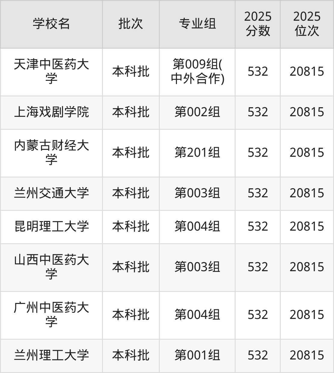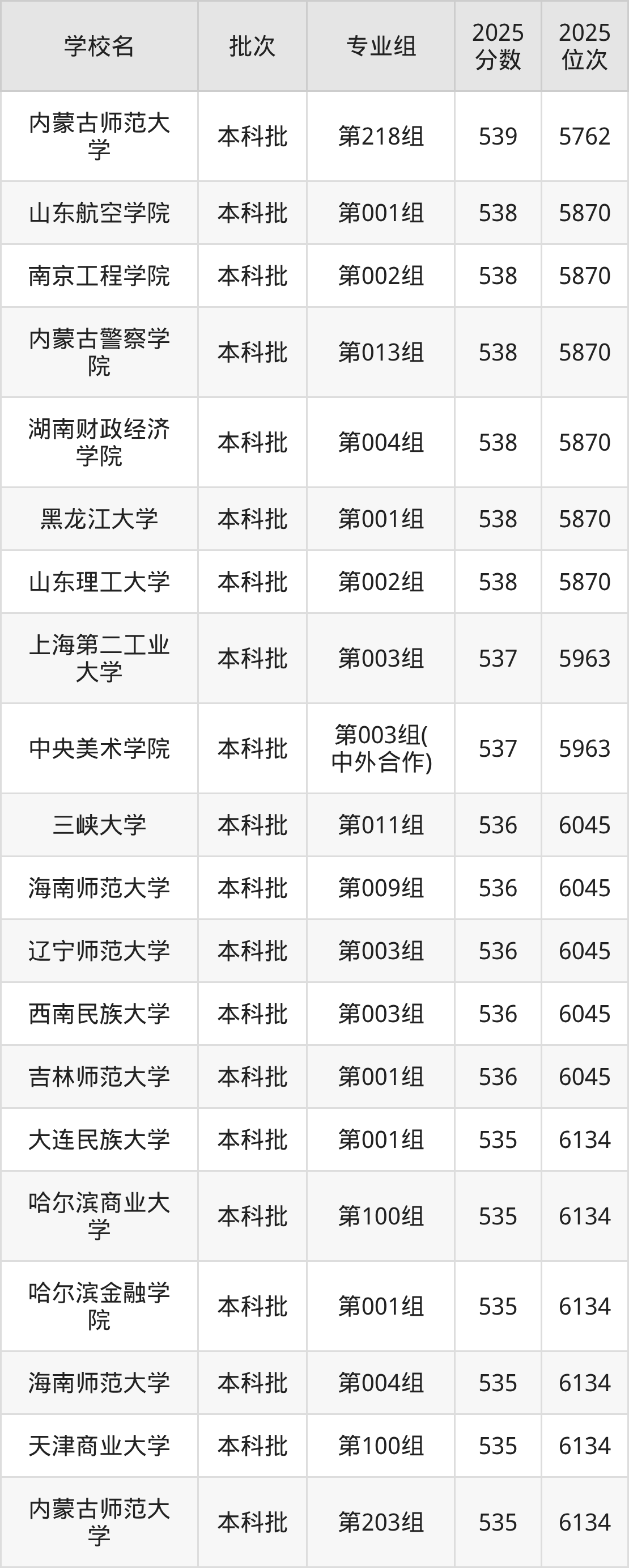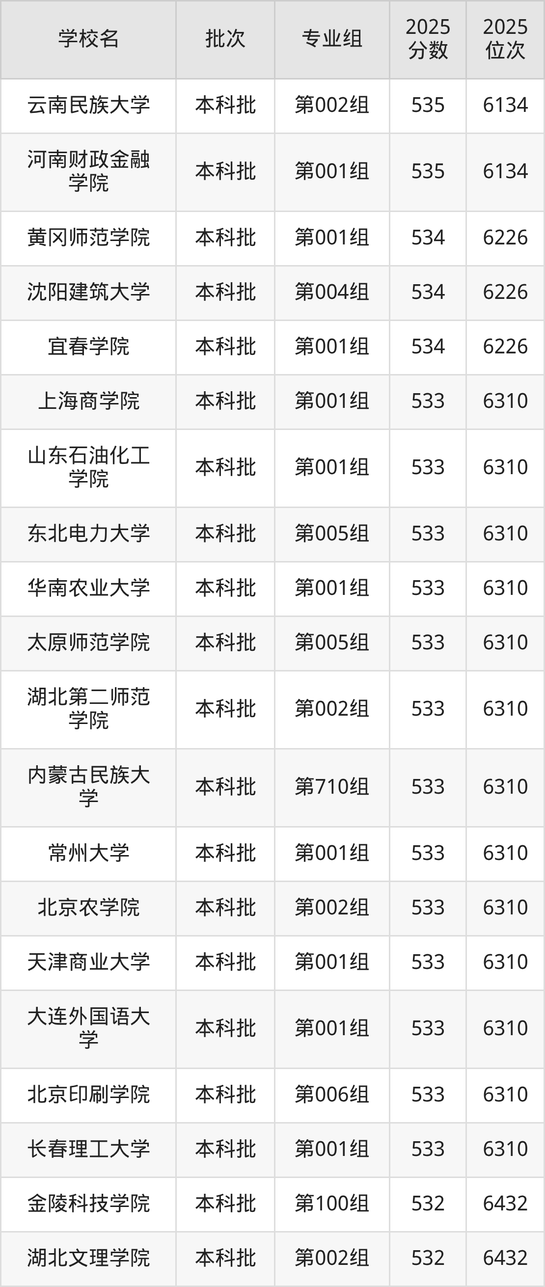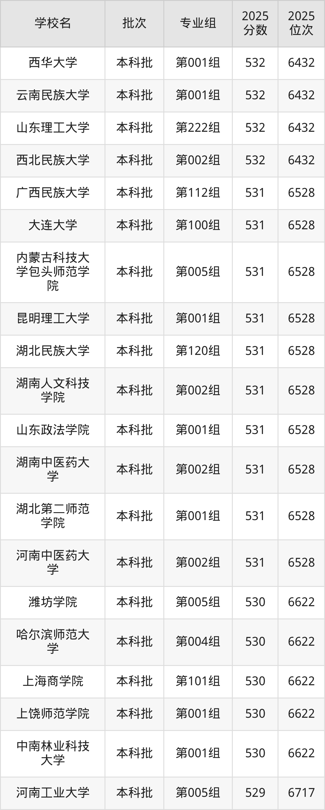 2025年内蒙古高考历史类533分(6227名~6310名)能上的大学有内蒙古民族大学第710组、山东石油化工学院第001组、东北电力大学第005组、太原师范学院第005组等。