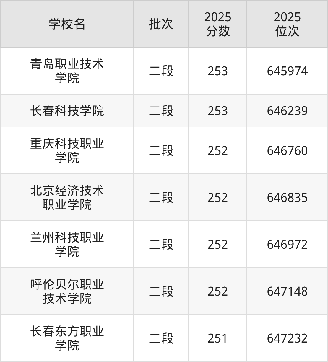 2025年山东高考252分(646459名~647210名)能上的大学有兰州科技职业学院、呼伦贝尔职业技术学院、重庆科技职业学院、北京经济技术职业学院。