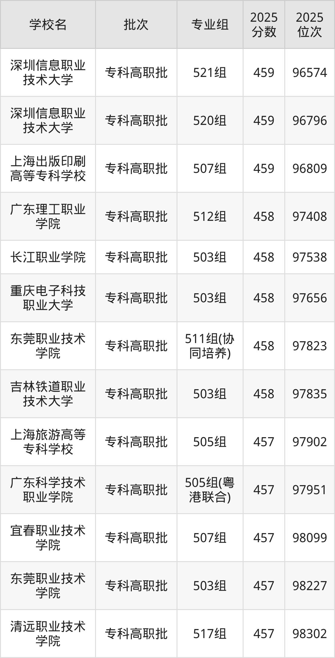 2025年广东高考历史类458分(96902名~97885名)能上的大学有长江职业学院503组、重庆电子科技职业大学503组、广东理工职业学院512组、吉林铁道职业技术大学503组等。