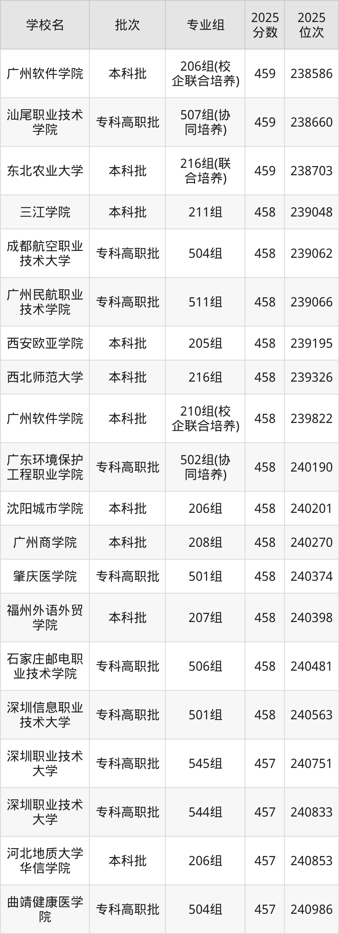 2025年广东高考物理类458分(238975名~240709名)能上的大学有西北师范大学216组、三江学院211组、广州软件学院210组(校企联合培养)、西安欧亚学院205组等。