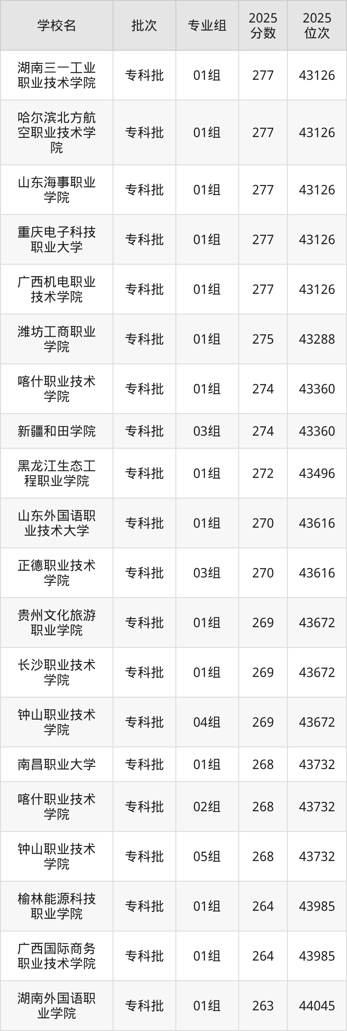 2025年江苏高考历史类269分(43617名~43672名)能上的大学有钟山职业技术学院04组、长沙职业技术学院01组、贵州文化旅游职业学院01组。