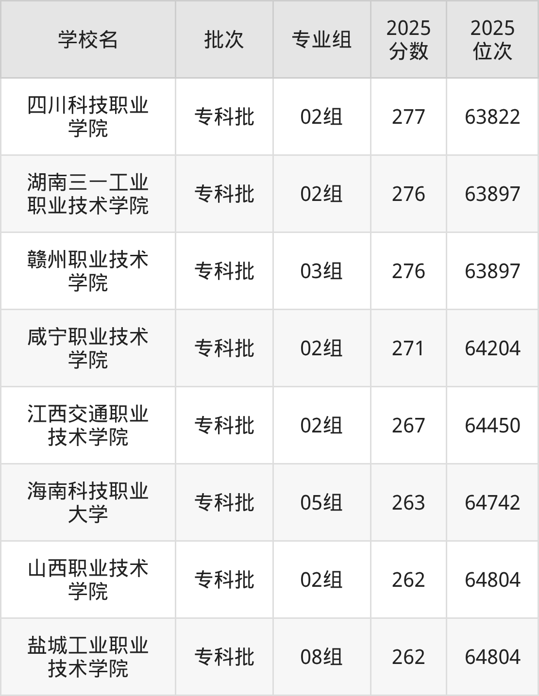 2025年江苏高考物理类269分(64273名~64333名)录取位次低于该区间(较稳妥)的有江西交通职业技术学院02组(64450名)、海南科技职业大学05组(64742名)等;录取位次高于该区间(可冲)的有咸宁职业技术学院02组(64204名)、赣州职业技术学院03组(63897名)等。