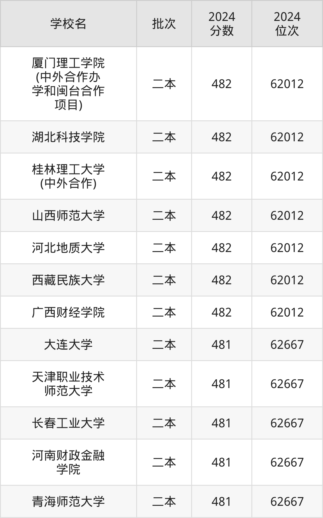 这些都是2025年高考理科62013名~62667名考生可以报考的大学,更多学校名单如下表所示: