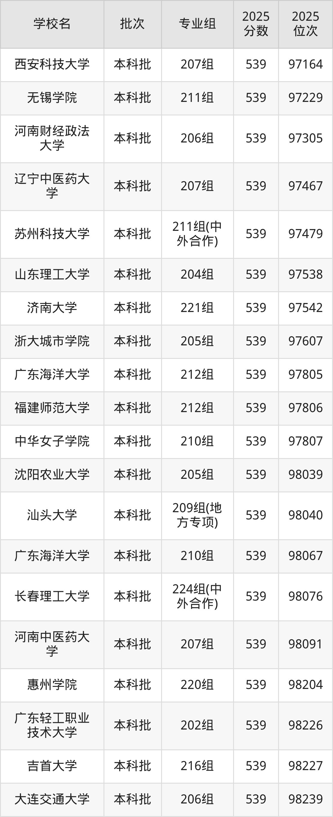 广东高考539分:历史类排名30648位、物理类排名98390位。该分数位次对应能上的大学历史类有淮北师范大学207组、井冈山大学201组;物理类有大连交通大学206组、沈阳农业大学205组,更多名单如下文所示,2026届考生可参考。