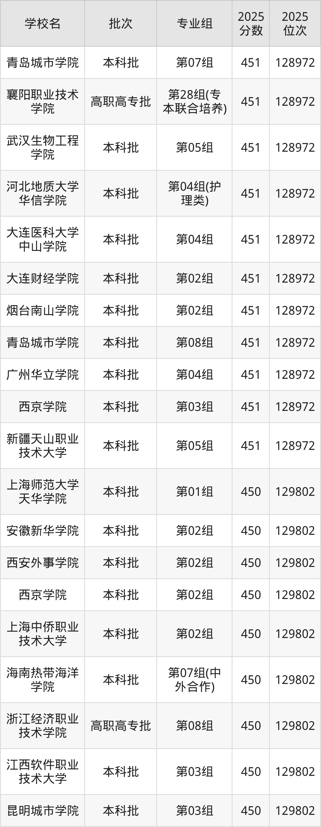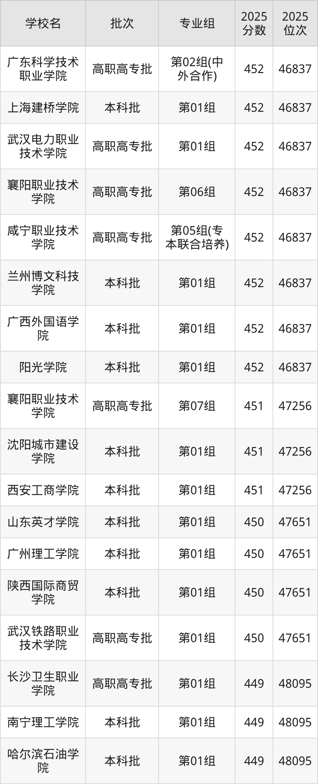 2025年湖北高考历史类450分(47257名~47651名)能上的大学有山东英才学院第01组、广州理工学院第01组、陕西国际商贸学院第01组、武汉铁路职业技术学院第01组。