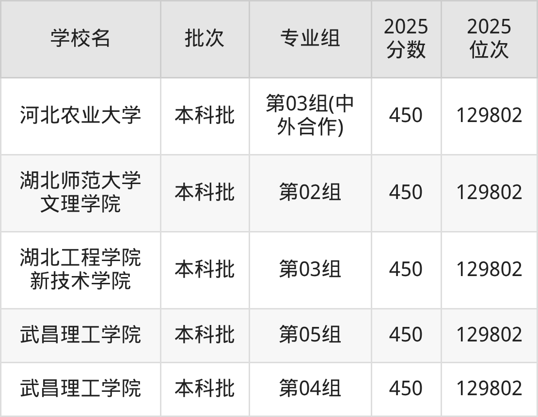 2025年湖北高考物理类450分(128973名~129802名)能上的大学有武昌理工学院第04组、武昌理工学院第05组、湖北工程学院新技术学院第03组、湖北师范大学文理学院第02组等。