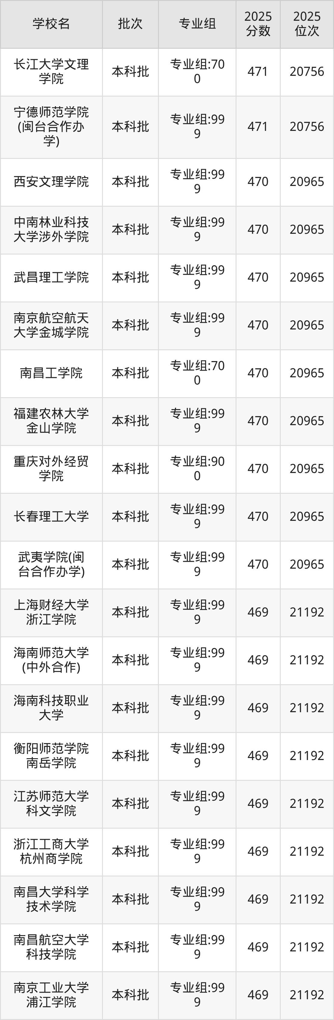 2025年福建高考历史类471分(20546名~20756名)能上的大学有宁德师范学院(闽台合作办学)专业组:999、长江大学文理学院专业组:700、湖北恩施学院专业组:999、湖北工程学院新技术学院专业组:999等。