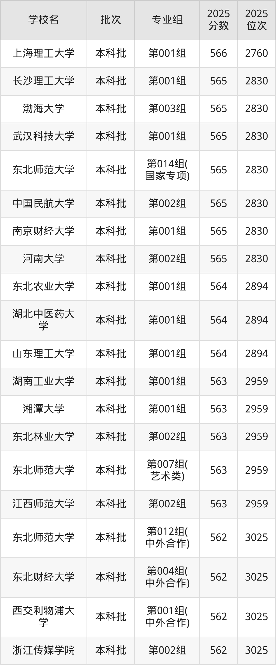 2025年吉林高考历史类563分(2895名~2959名)能上的大学有东北师范大学第007组(艺术类)、东北林业大学第002组、江西师范大学第002组、湘潭大学第001组等。