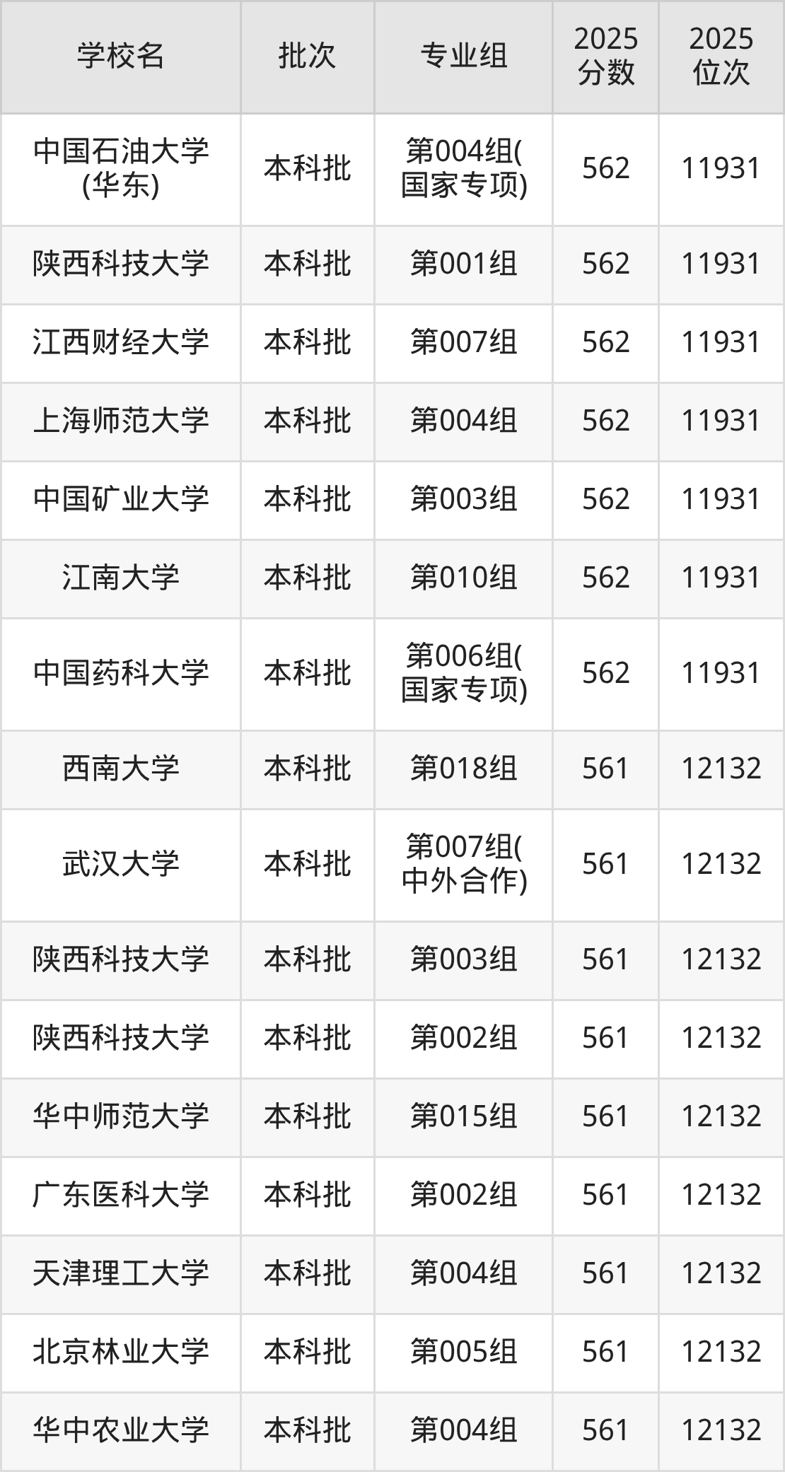 另外录取位次低于该区间(较稳妥)的有陕西科技大学第001组(11931名)、中国石油大学(华东)第004组(国家专项)(11931名)等;录取位次高于该区间(可冲)的有北京林业大学第006组(11509名)、中国民航大学第005组(11509名)等。