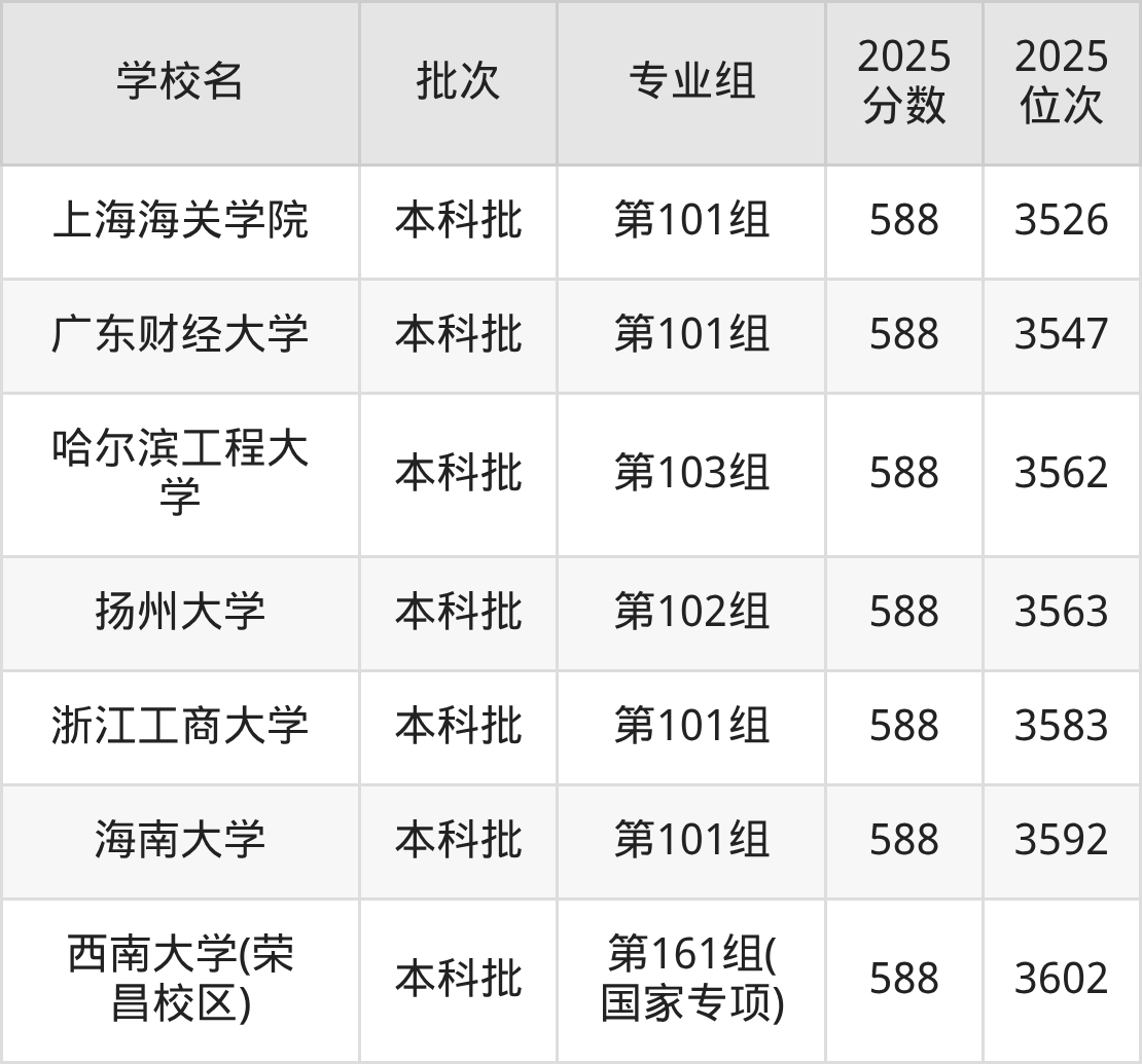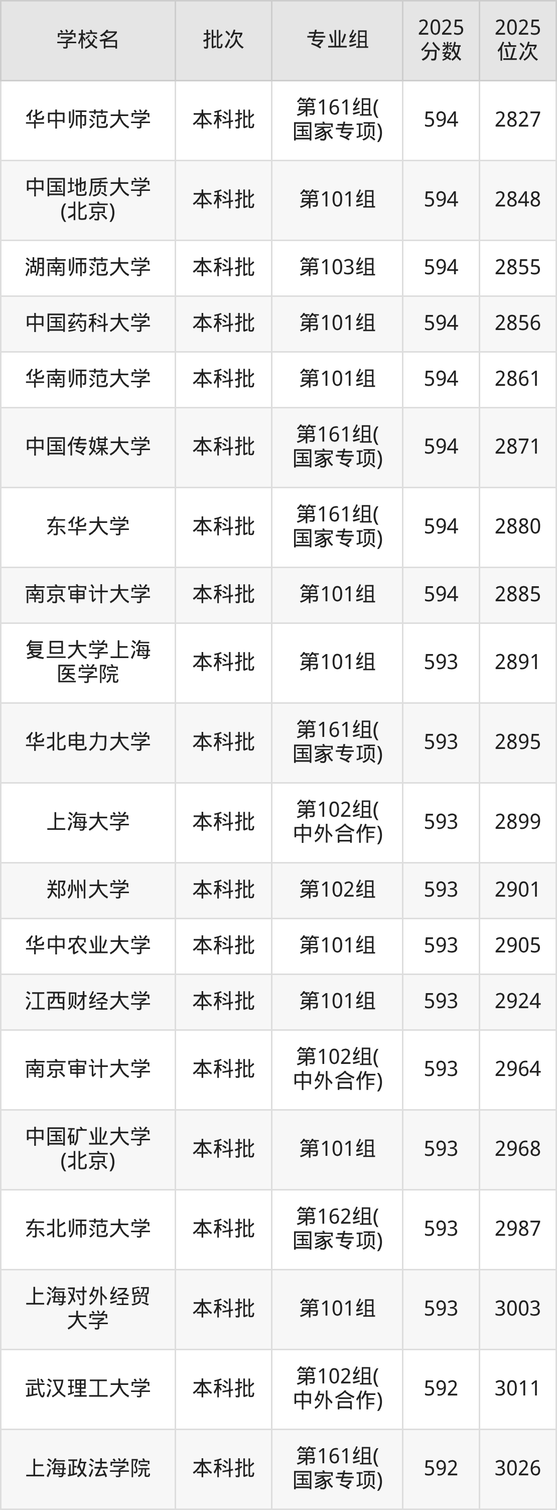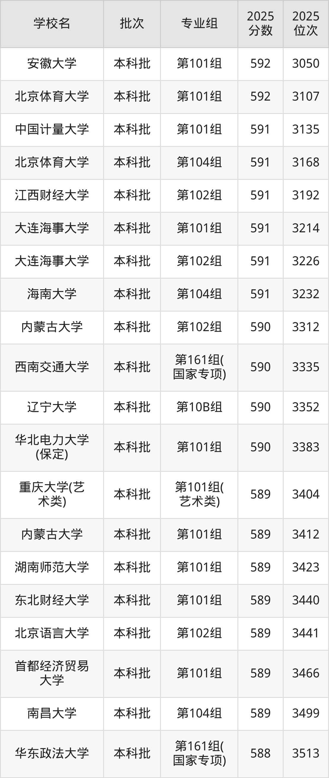 2025年江西高考历史类592分(3010名~3125名)能上的大学有北京体育大学第101组、安徽大学第101组、武汉理工大学第102组(中外合作)、上海政法学院第161组(国家专项)。