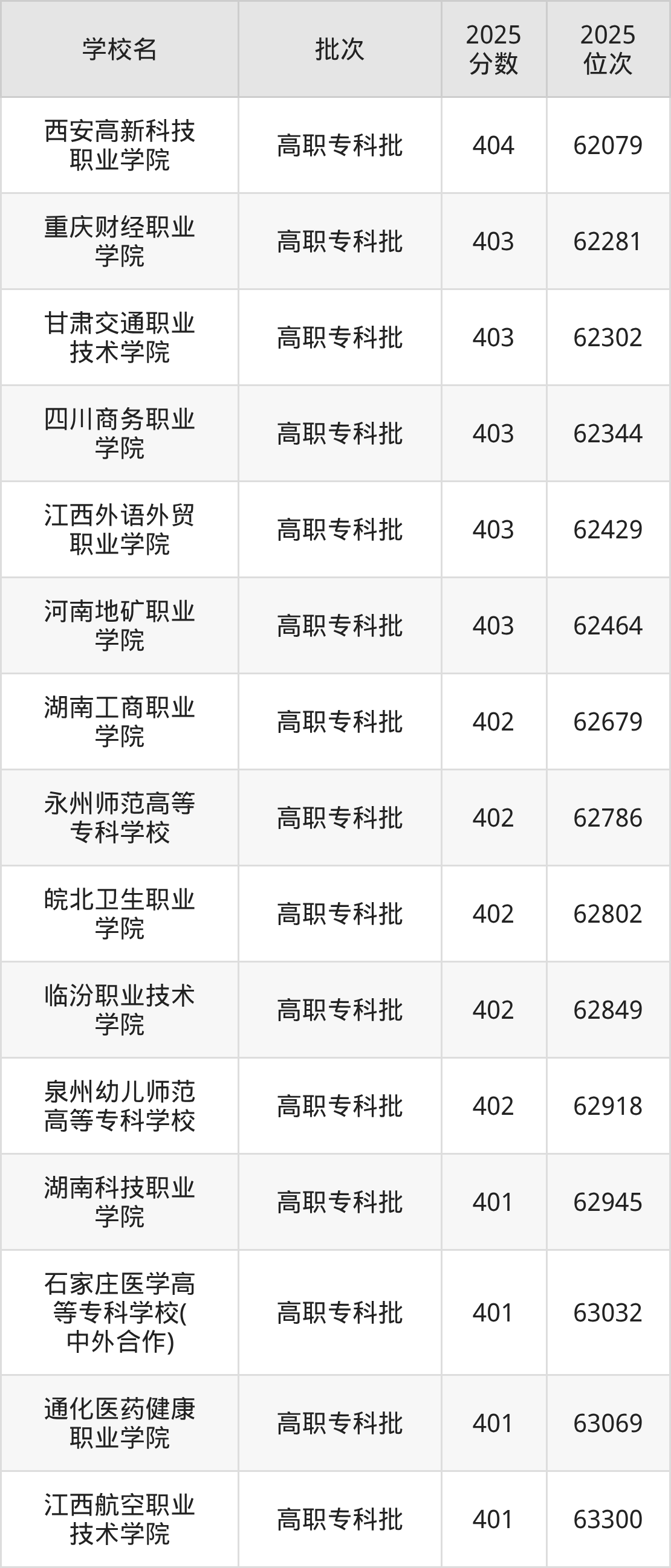 另外录取位次低于该区间(较稳妥)的有湖南科技职业学院(62945名)、石家庄医学高等专科学校(中外合作)(63032名)等;录取位次高于该区间(可冲)的有河南地矿职业学院(62464名)、江西外语外贸职业学院(62429名)等。