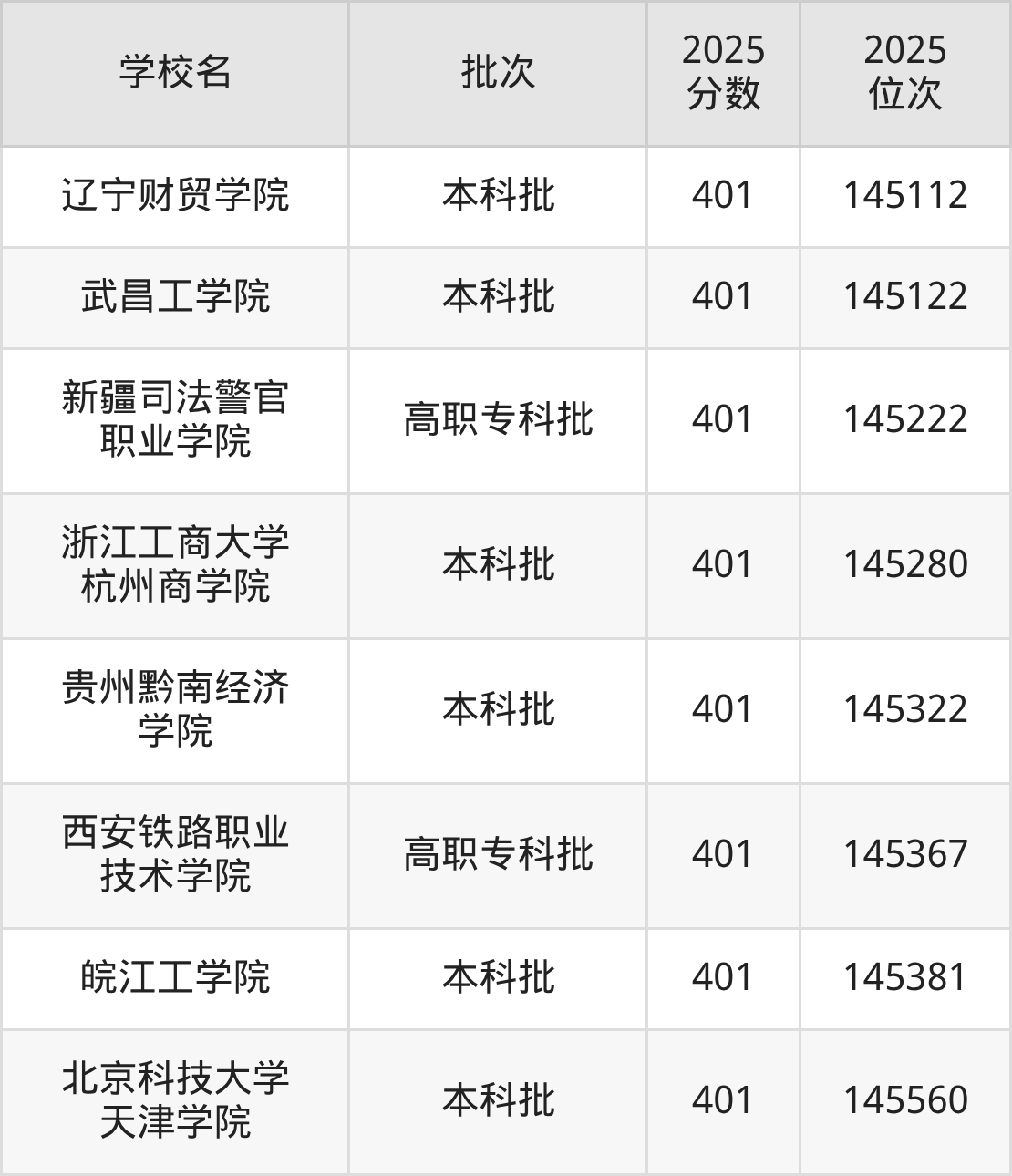 贵州高考402分:历史类排名62940位、物理类排名145095位。该分数位次对应能上的大学历史类有皖北卫生职业学院、临汾职业技术学院;物理类有丽江文化旅游学院、武昌理工学院,更多名单如下文所示,2026届考生可参考。