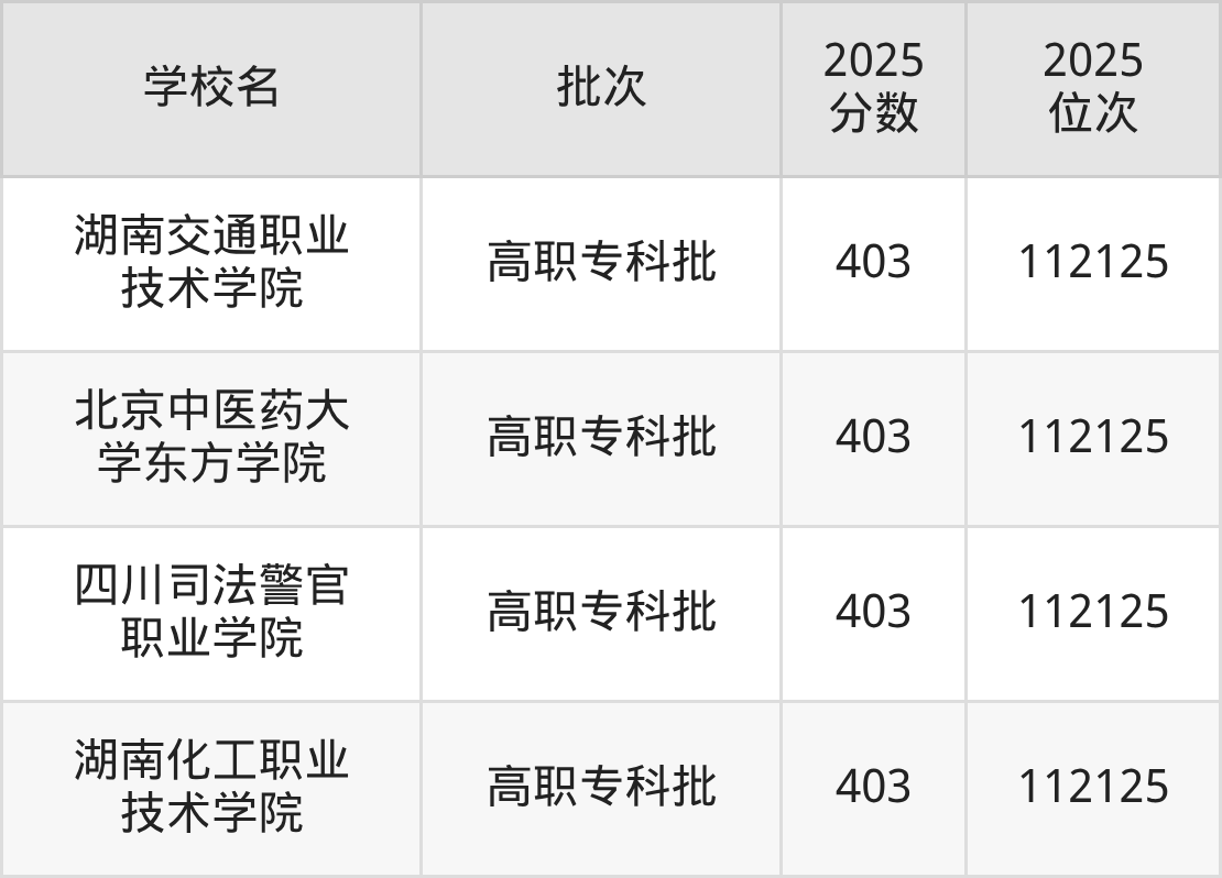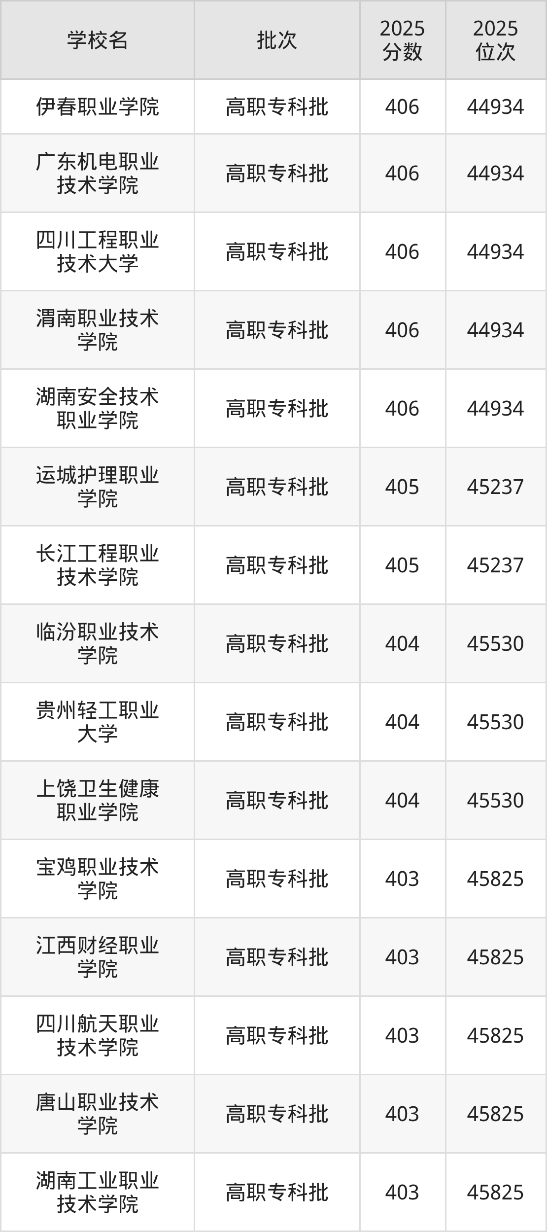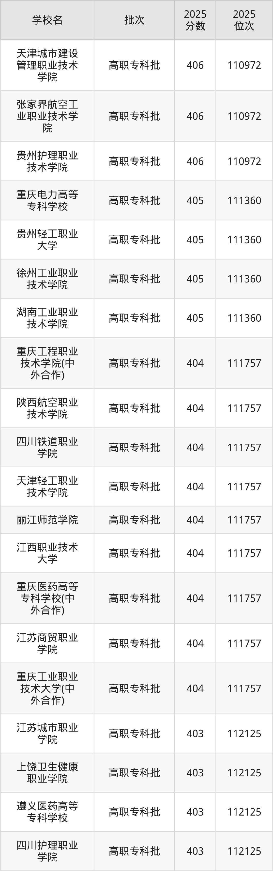 2025年重庆高考历史类404分(45238名~45530名)能上的大学有上饶卫生健康职业学院、贵州轻工职业大学、临汾职业技术学院。