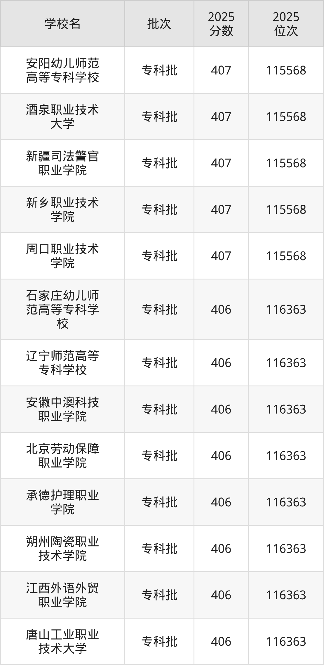 2025年河北高考历史类406分(115569名~116363名)能上的大学有江西外语外贸职业学院、朔州陶瓷职业技术学院、唐山工业职业技术大学、北京劳动保障职业学院等。