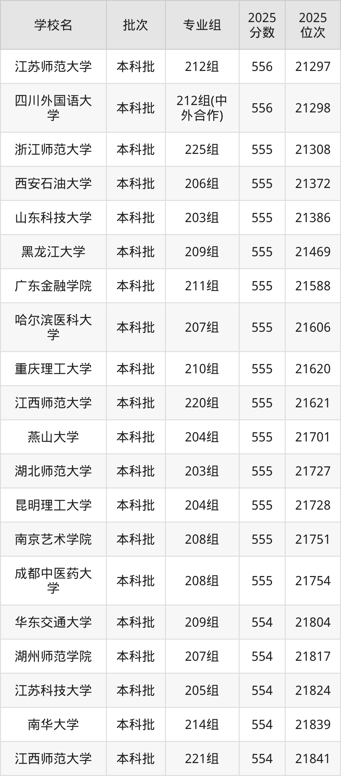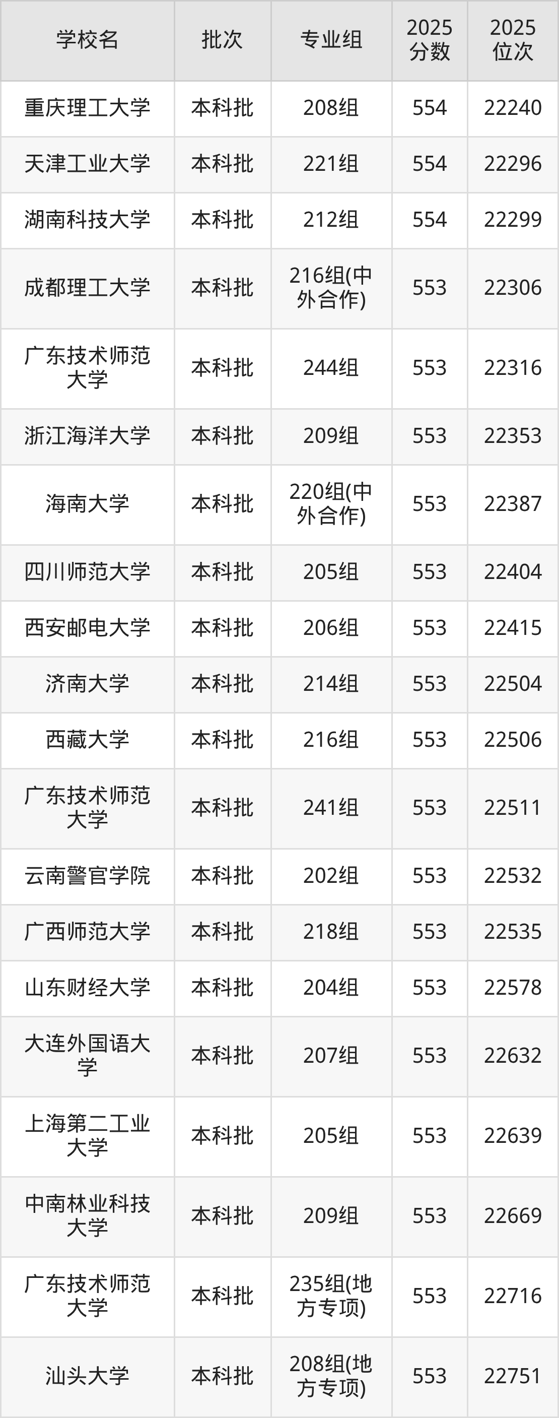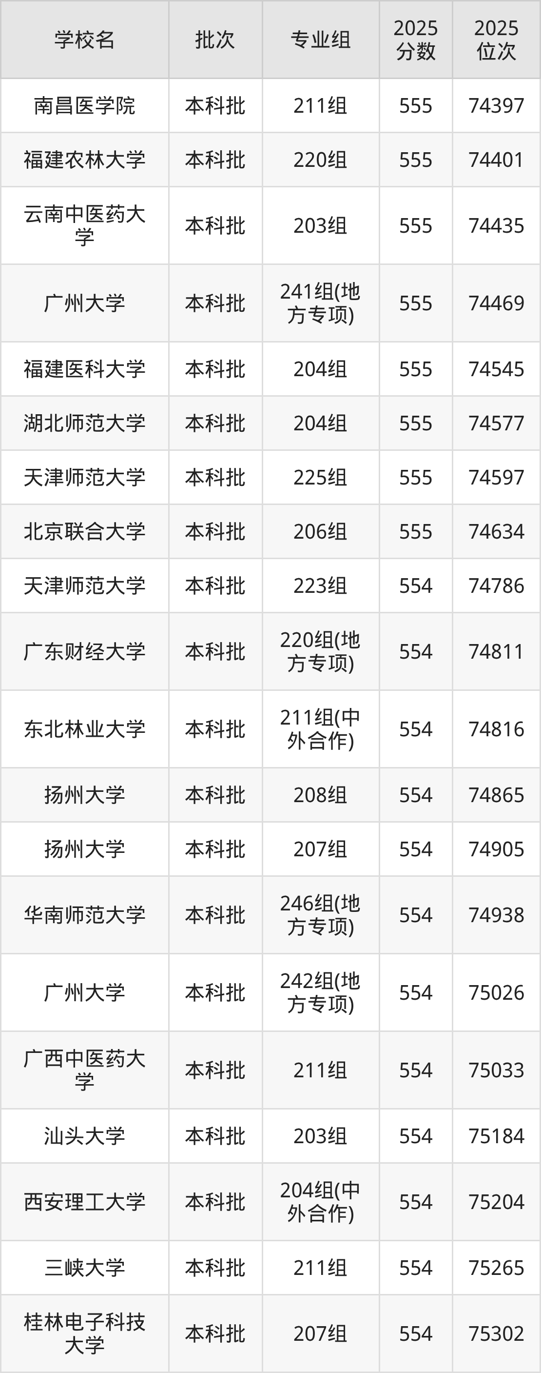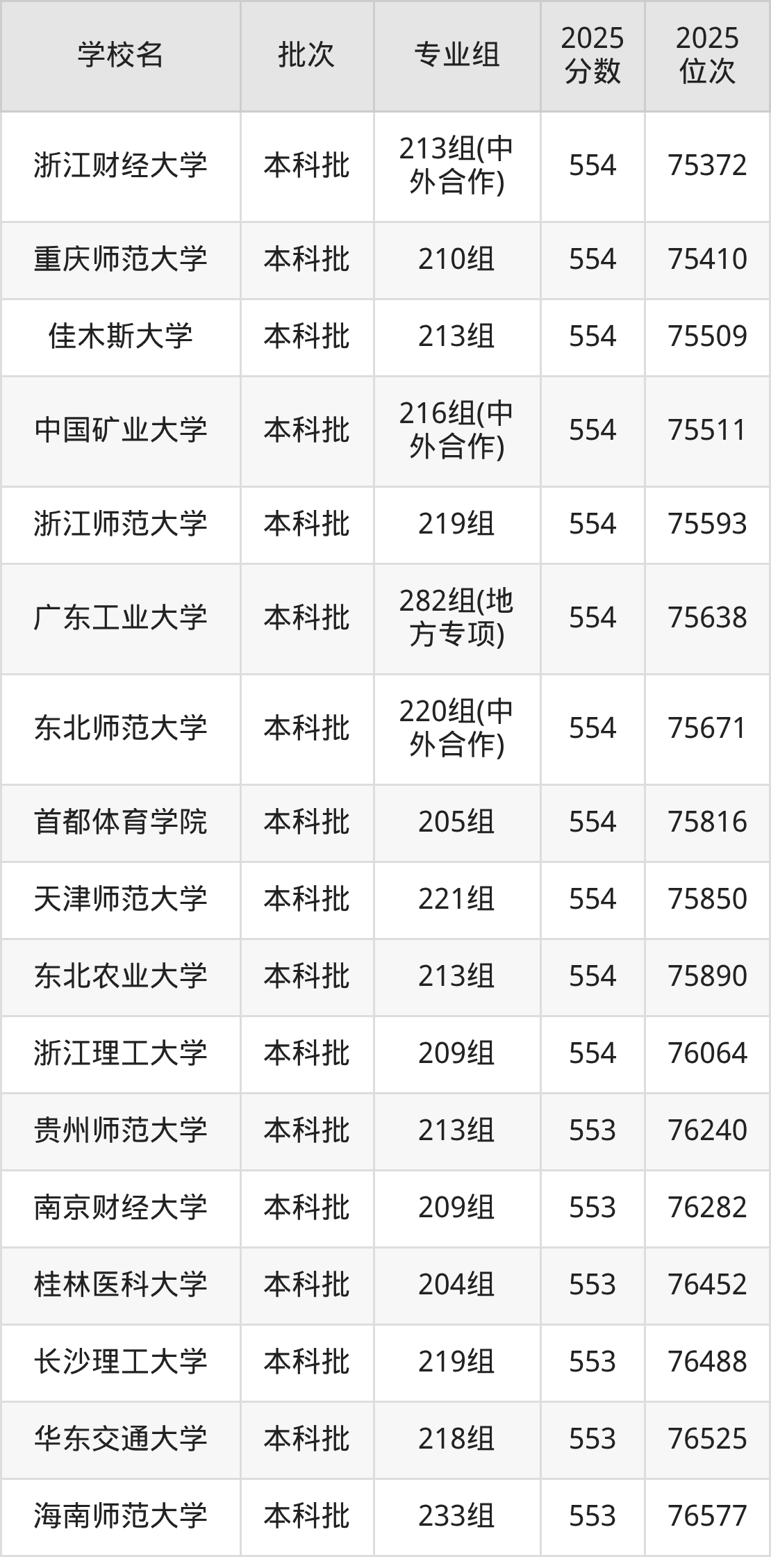2025年广东高考物理类554分(74784名~76147名)能上的大学有首都体育学院205组、天津师范大学221组、天津师范大学223组、东北师范大学220组(中外合作)等。