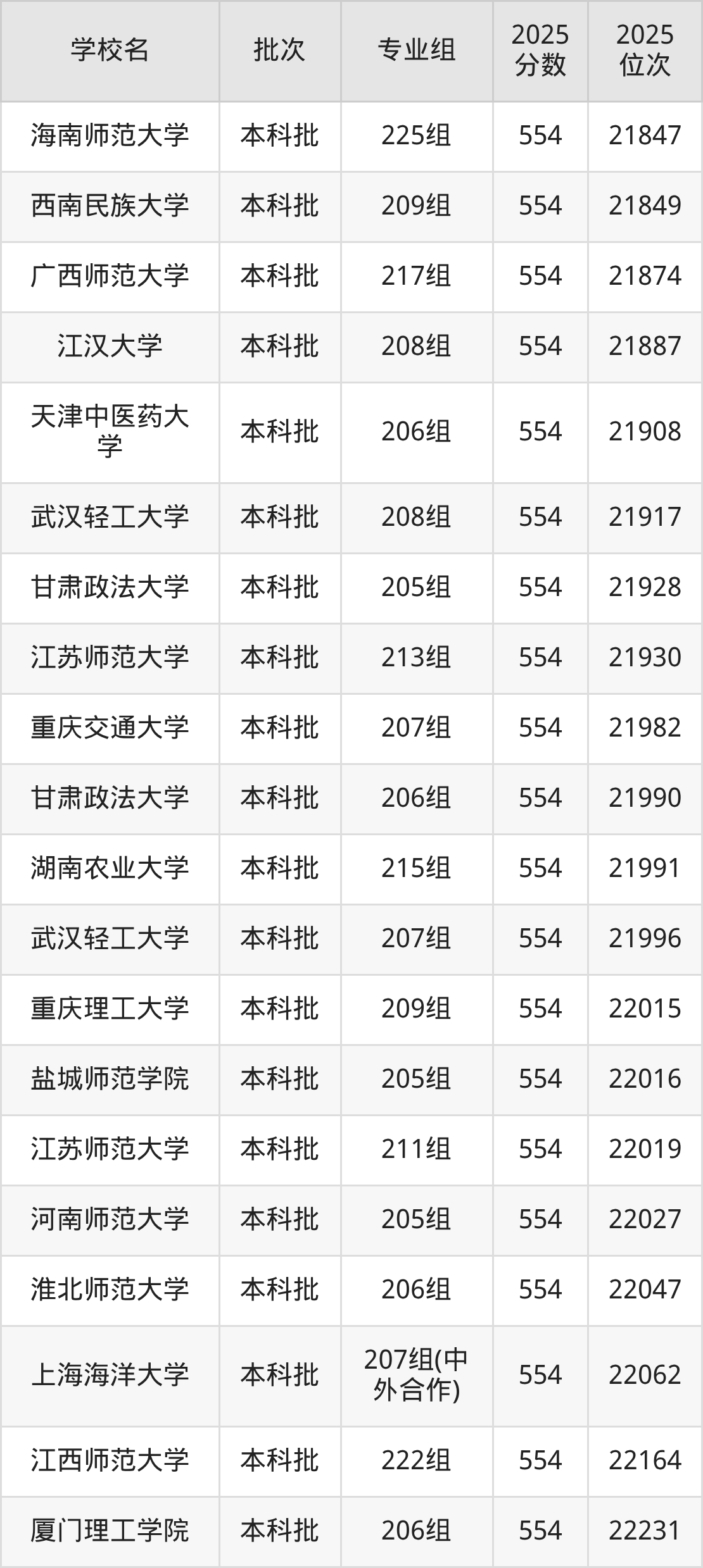 2025年广东高考历史类554分(21789名~22300名)能上的大学有天津工业大学221组、天津中医药大学206组、上海海洋大学207组(中外合作)、江苏科技大学205组等。
