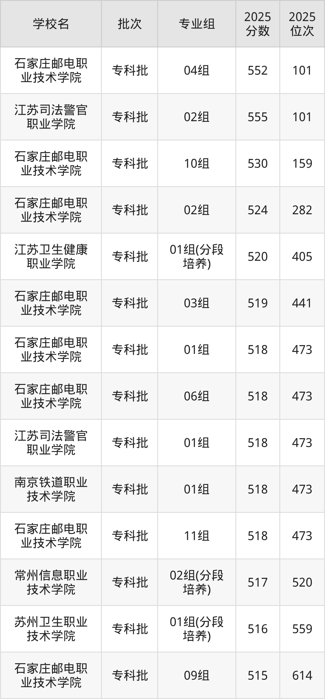 另外录取位次低于该区间(较稳妥)的有江苏司法警官职业学院04组(1195名)、石家庄邮电职业技术学院23组(1357名)等;录取位次高于该区间(可冲)的有南京工程学院04组(联合培养项目)(113739名)、南京体育学院06组(113739名)等。