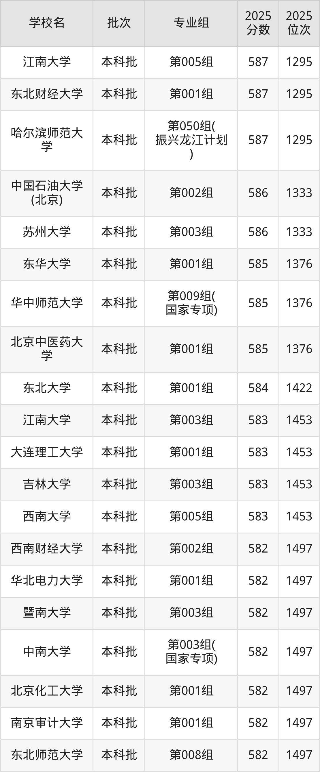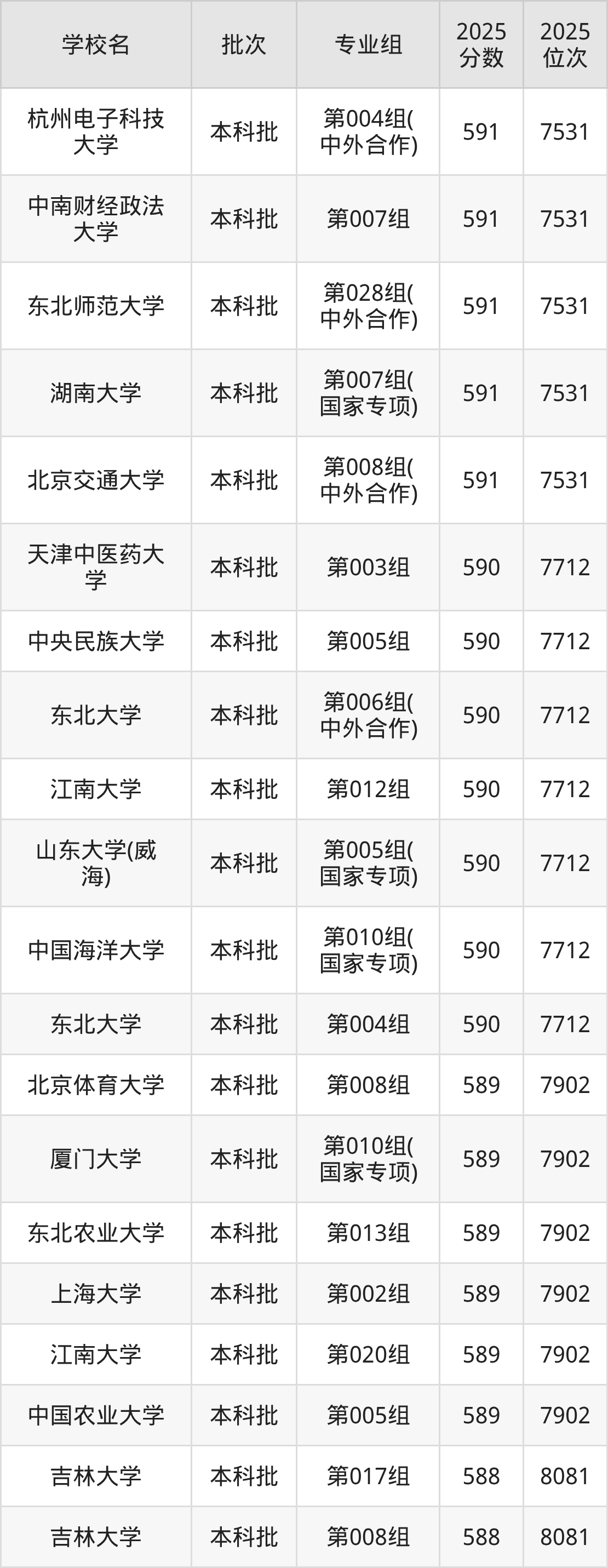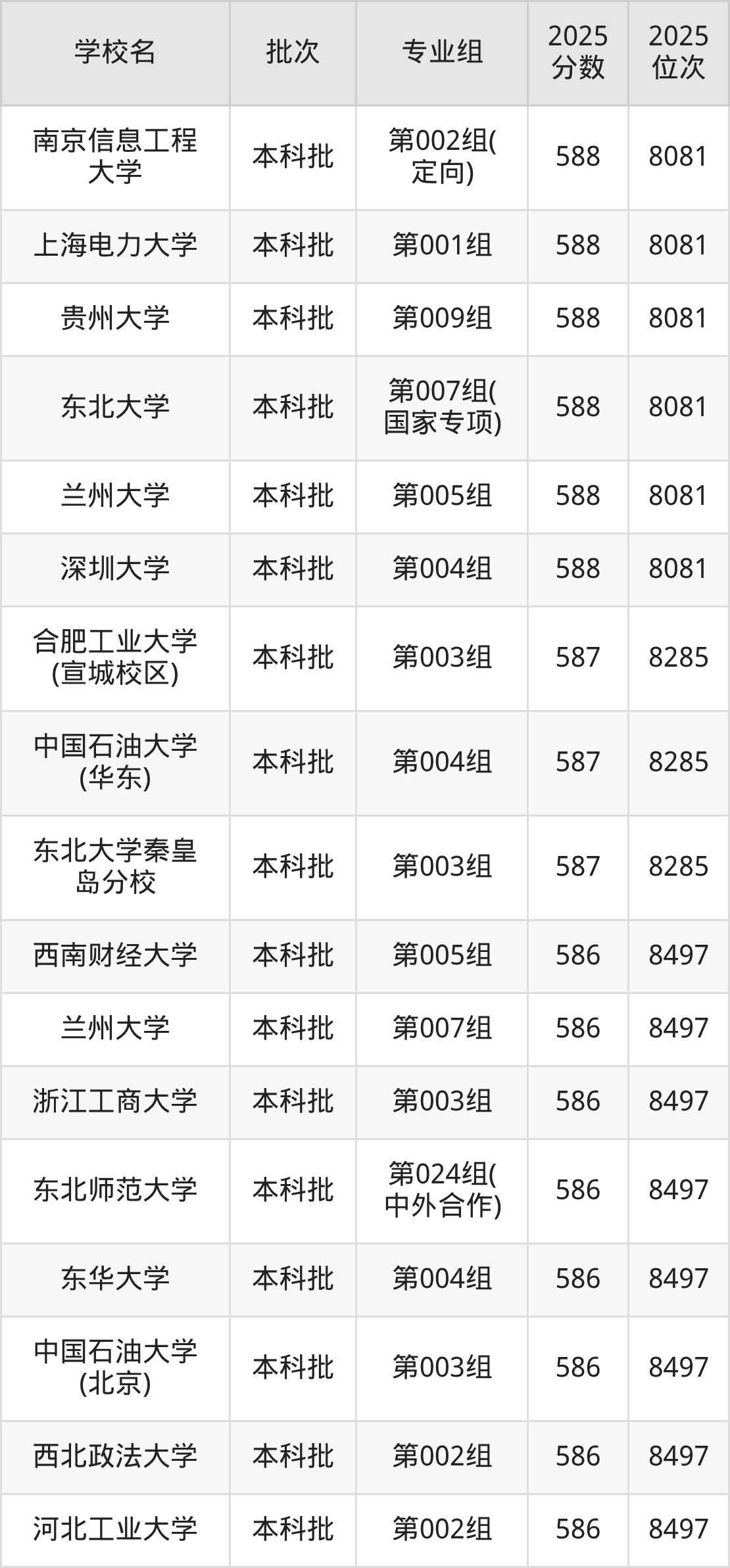 2025年黑龙江高考物理类588分(7903名~8081名)能上的大学有东北大学第007组(国家专项)、吉林大学第008组、吉林大学第017组、上海电力大学第001组等。