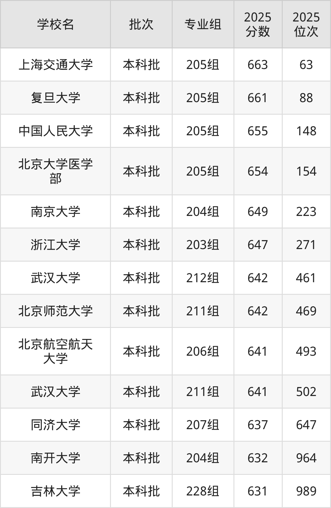 2025年广东高考历史类639分(554名~600名)录取位次低于该区间(较稳妥)的有同济大学207组(647名)、南开大学204组(964名)等;录取位次高于该区间(可冲)的有武汉大学211组(502名)、北京航空航天大学206组(493名)等。