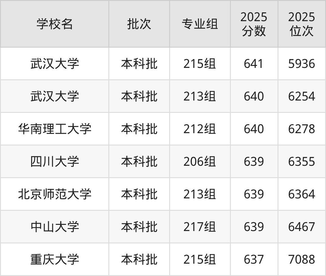 2025年广东高考物理类639分(6296名~6603名)能上的大学有北京师范大学213组、中山大学217组、四川大学206组。