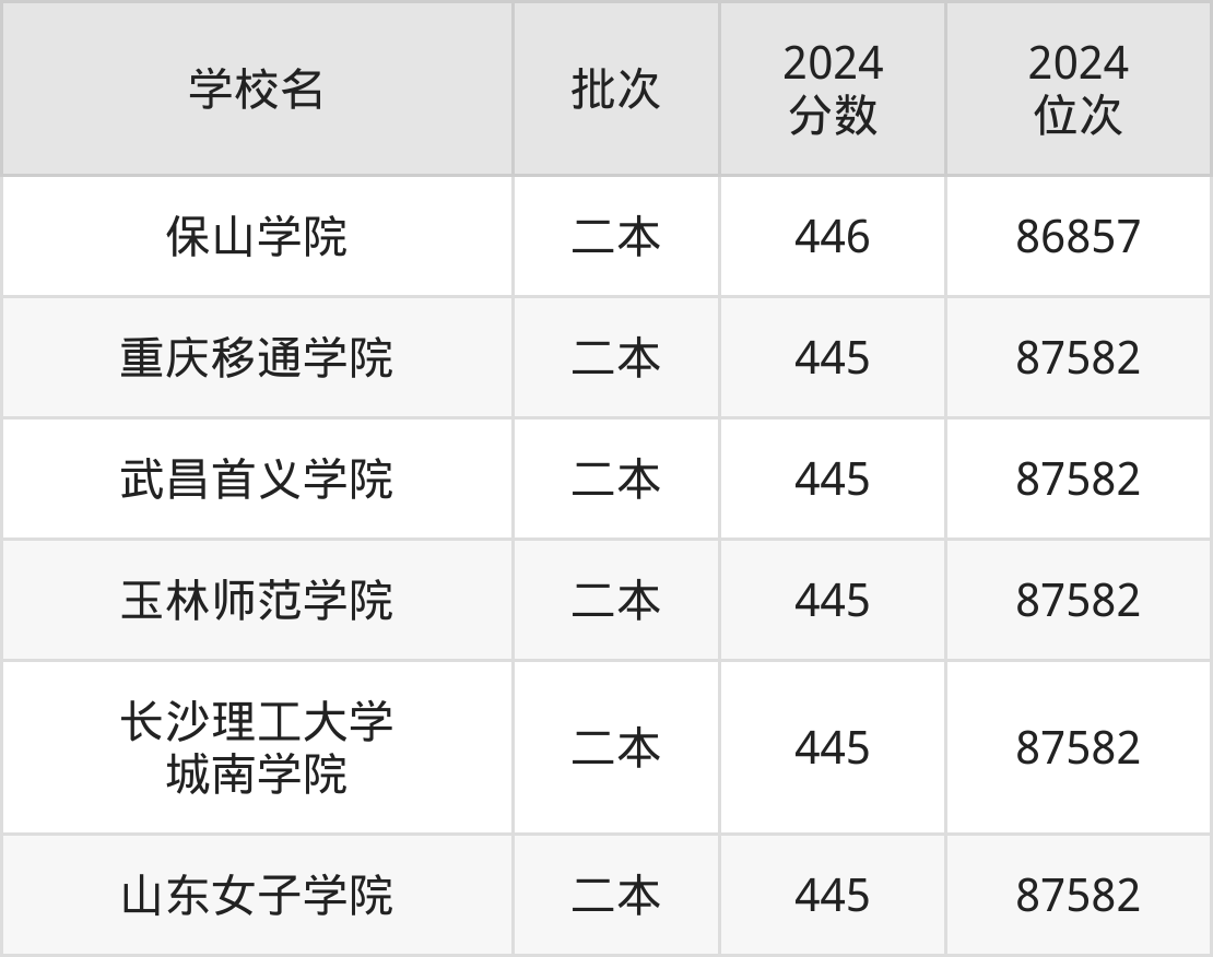 2024年云南高考理科445分(86858名~87582名)能上的大学有山东女子学院、长沙理工大学城南学院、玉林师范学院、武昌首义学院等。