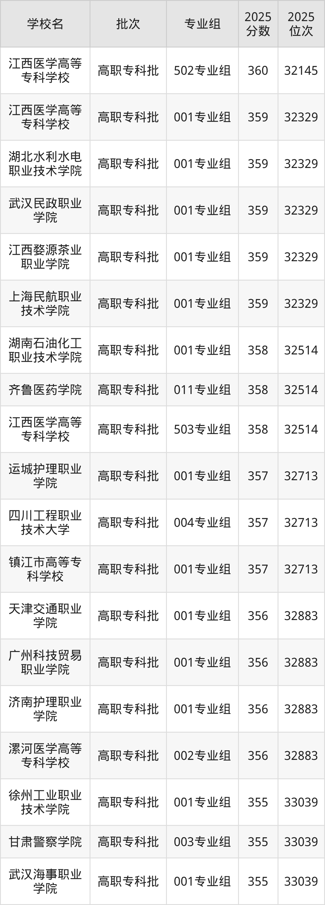 另外录取位次低于该区间(较稳妥)的有广州科技贸易职业学院001专业组(32883名)、漯河医学高等专科学校002专业组(32883名)等;录取位次高于该区间(可冲)的有江西医学高等专科学校503专业组(32514名)、齐鲁医药学院011专业组(32514名)等。