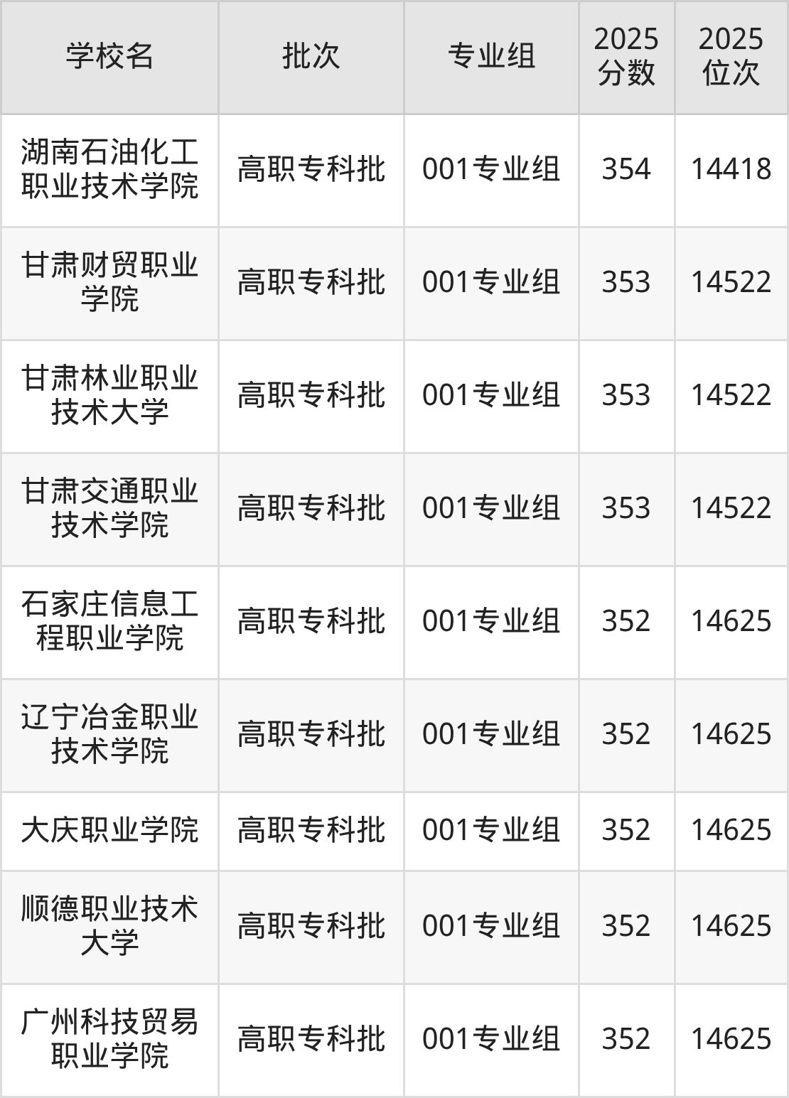 另外录取位次低于该区间(较稳妥)的有南充职业技术学院001专业组(14323名)、福州职业技术学院001专业组(14323名)等;录取位次高于该区间(可冲)的有七台河职业学院001专业组(14056名)、青岛职业技术学院001专业组(14056名)等。