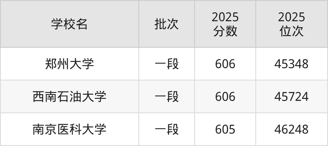 2025年浙江高考606分(45002名~46041名)能上的大学有西南石油大学、郑州大学。