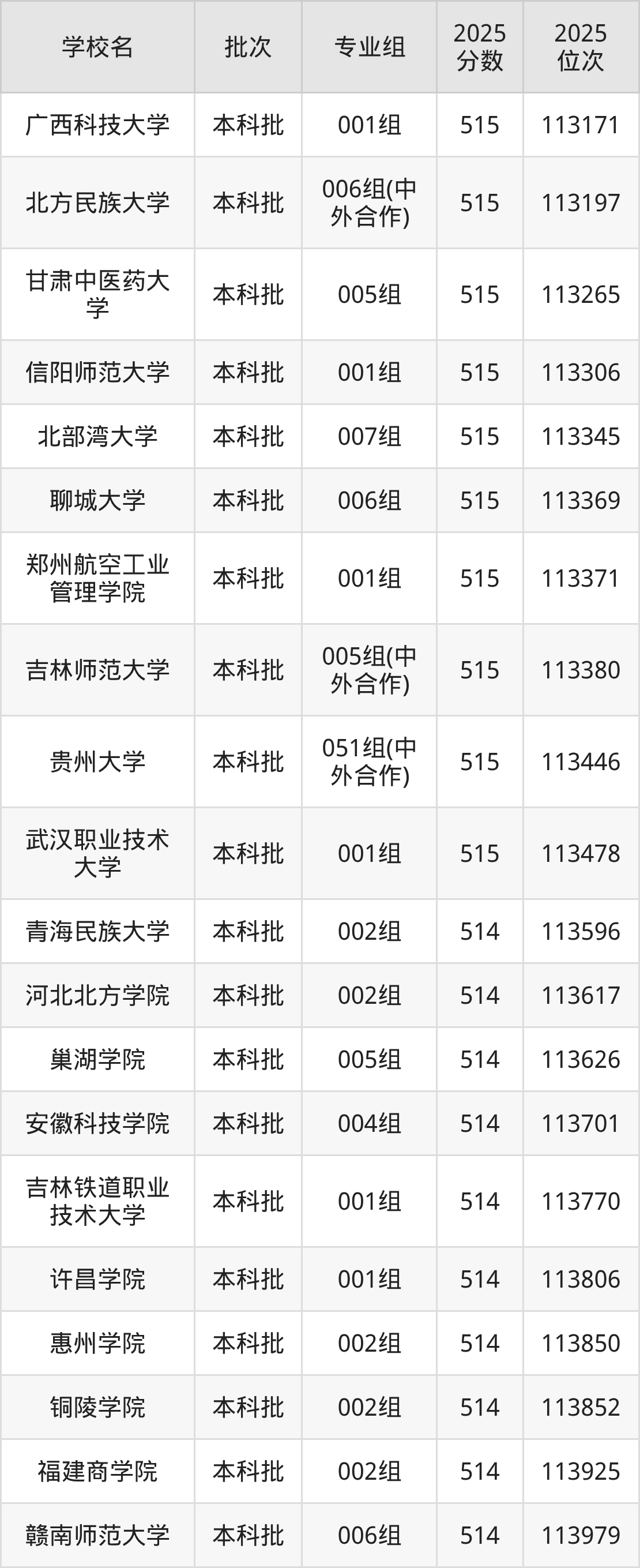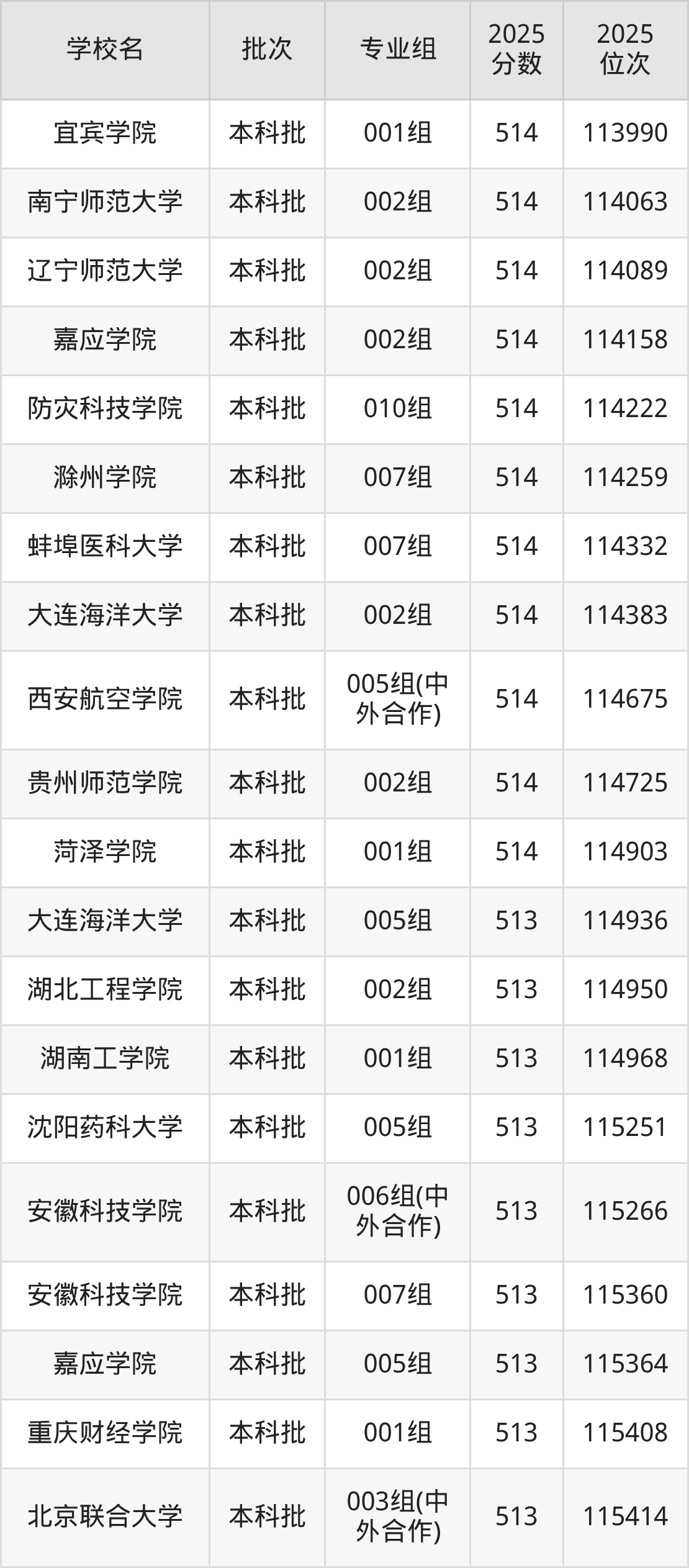 2025年安徽高考物理类514分(113546名~114928名)能上的大学有大连海洋大学002组、防灾科技学院010组、福建商学院002组、赣南师范大学006组等。