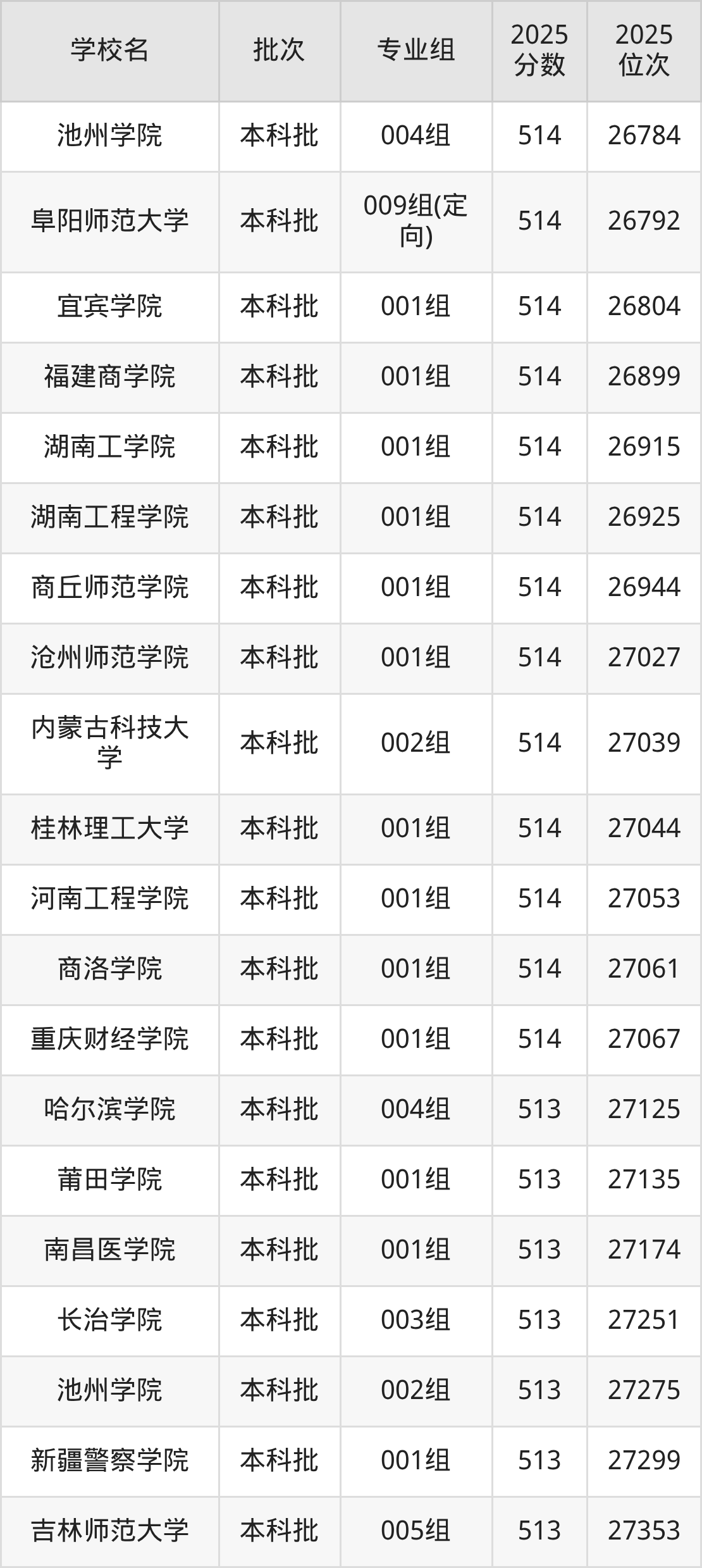2025年安徽高考历史类514分(26692名~27096名)能上的大学有沧州师范学院001组、重庆财经学院001组、防灾科技学院002组、福建商学院001组等。