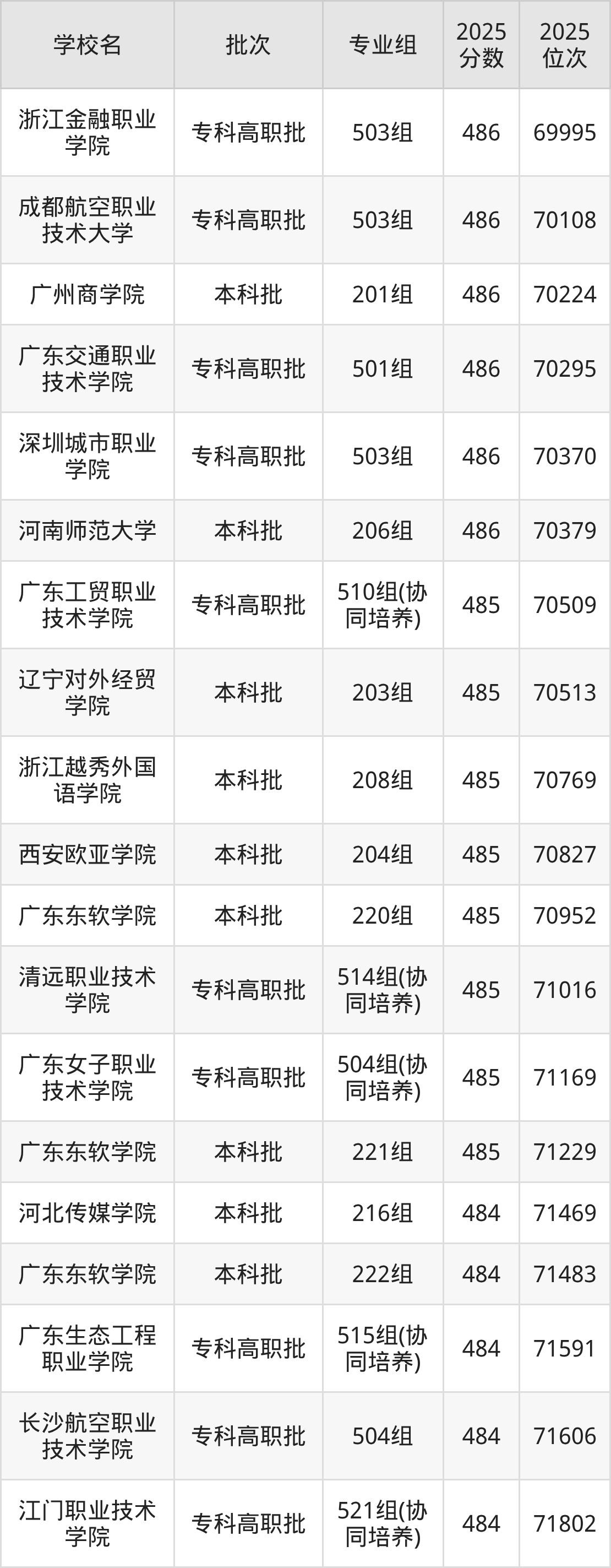 2025年广东高考历史类485分(70489名~71380名)能上的大学有辽宁对外经贸学院203组、广东东软学院220组、广东东软学院221组、西安欧亚学院204组等。