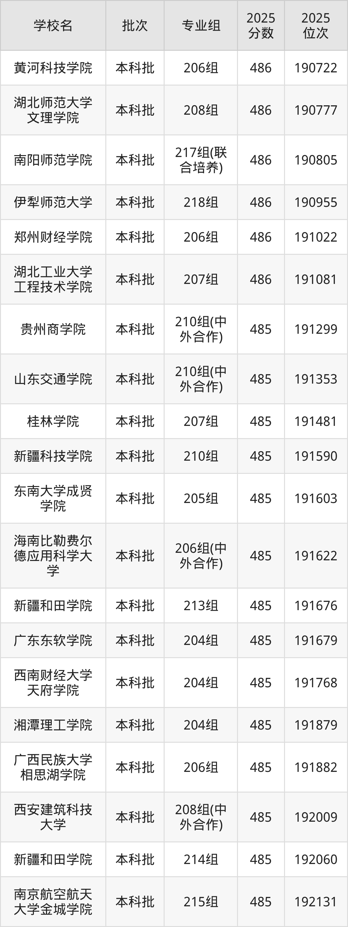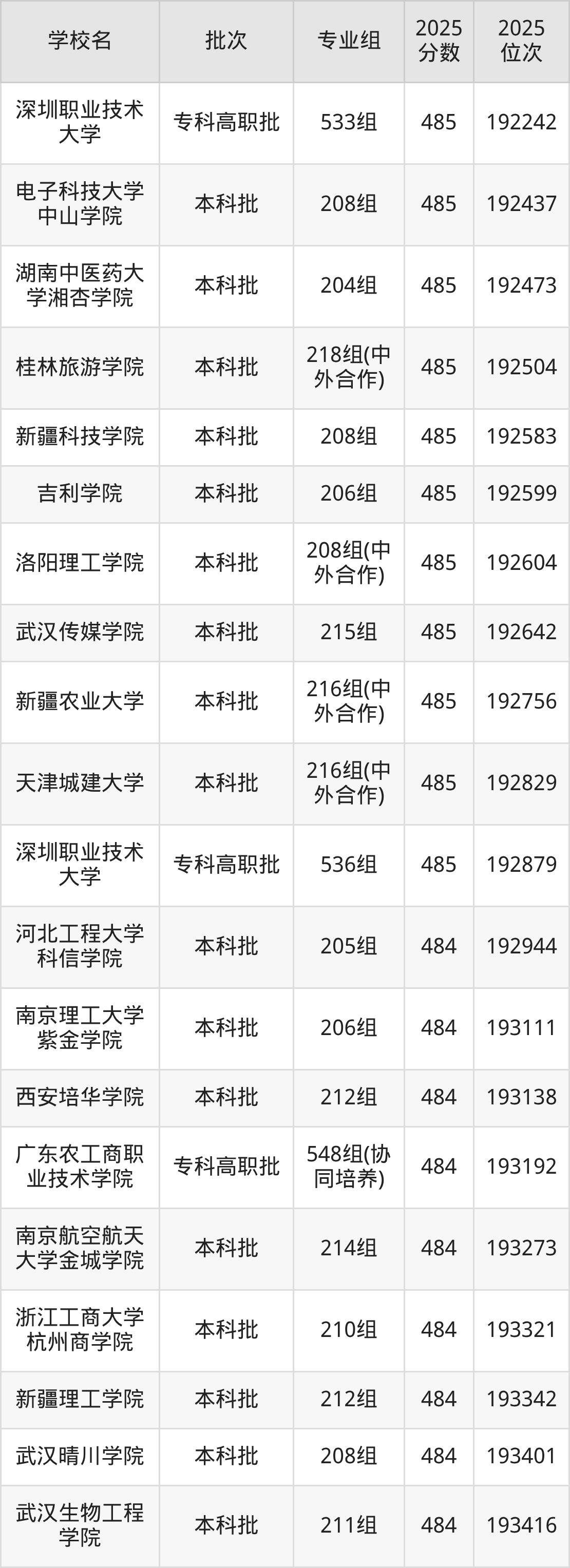 2025年广东高考物理类485分(191184名~192931名)能上的大学有西安建筑科技大学208组(中外合作)、新疆农业大学216组(中外合作)、新疆和田学院213组、新疆和田学院214组等。