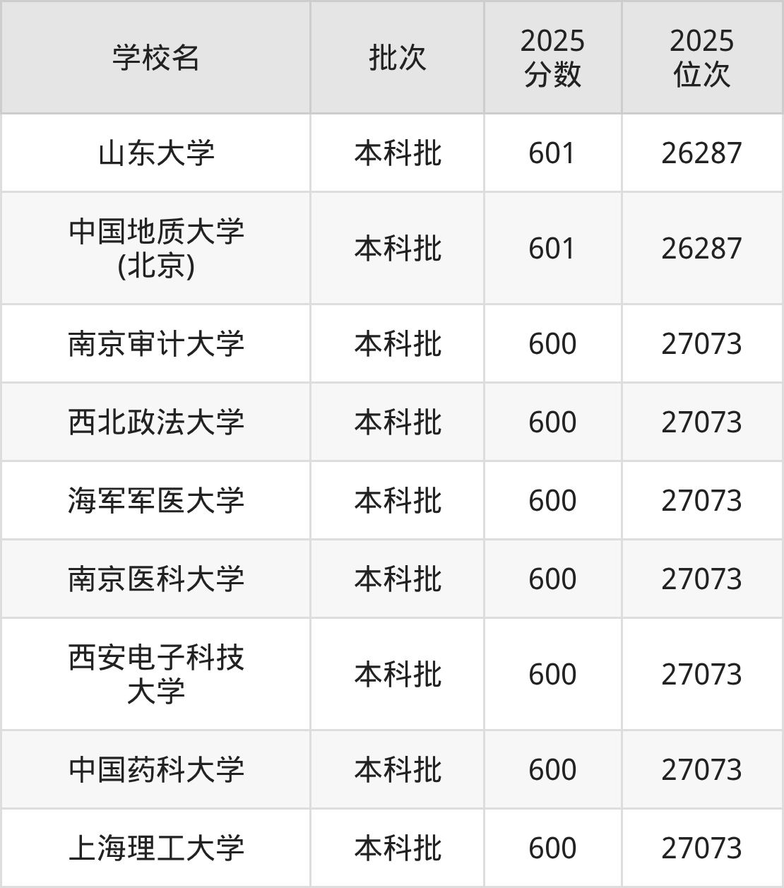 2025年河北高考物理类600分(26288名~27073名)能上的大学有上海理工大学、中国药科大学、西安电子科技大学、南京医科大学等。