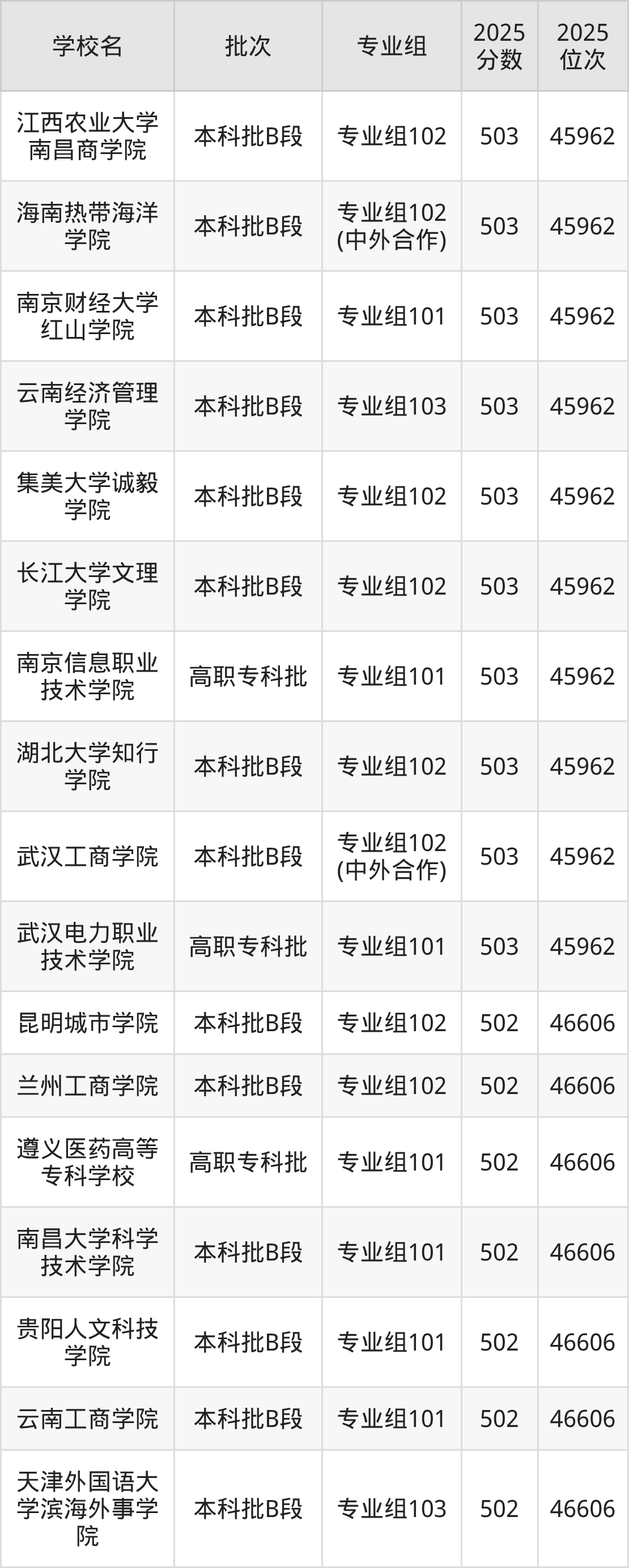 另外录取位次低于该区间(较稳妥)的有浙江师范大学行知学院专业组101(47286名)、浙江工商大学杭州商学院专业组102(47286名)等;录取位次高于该区间(可冲)的有武汉工商学院专业组102(中外合作)(45962名)、江西农业大学南昌商学院专业组102(45962名)等。