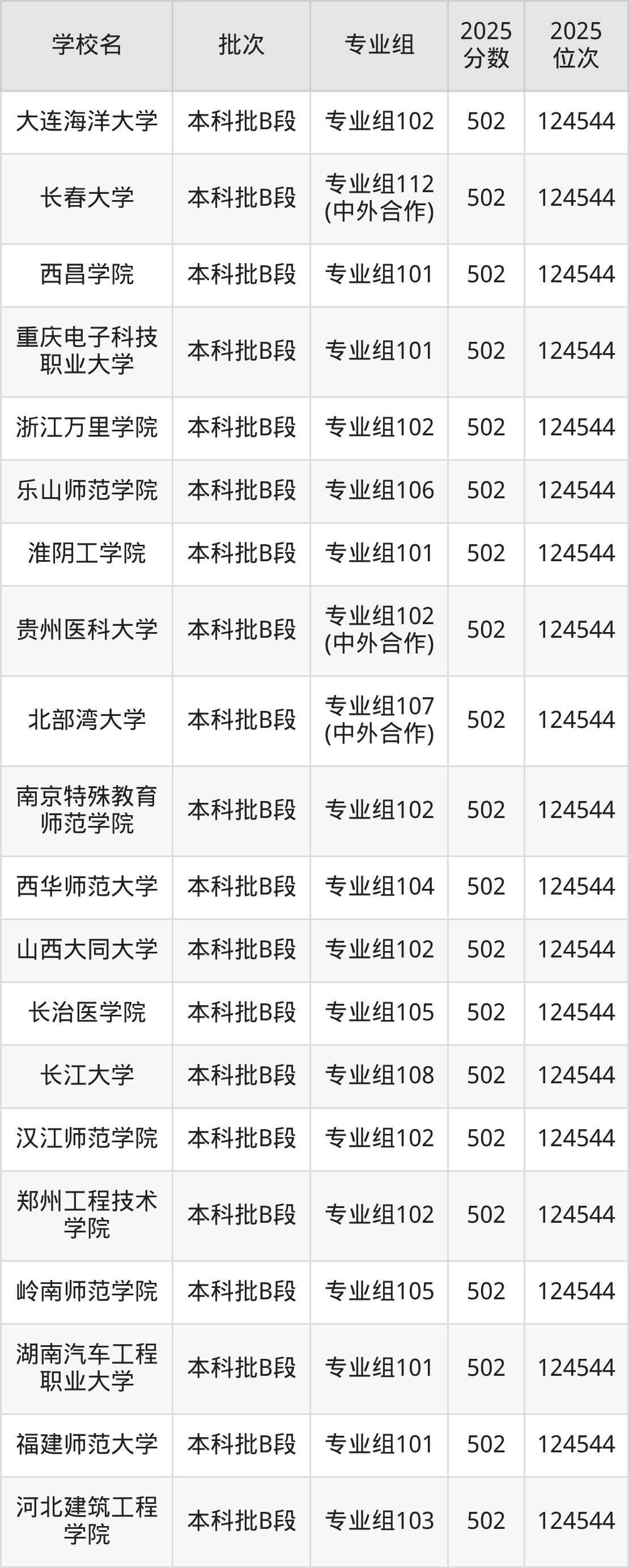 2025年四川高考物理类502分(123201名~124544名)能上的大学有乐山师范学院专业组106、淮阴工学院专业组101、贵州医科大学专业组102(中外合作)、北部湾大学专业组107(中外合作)等。