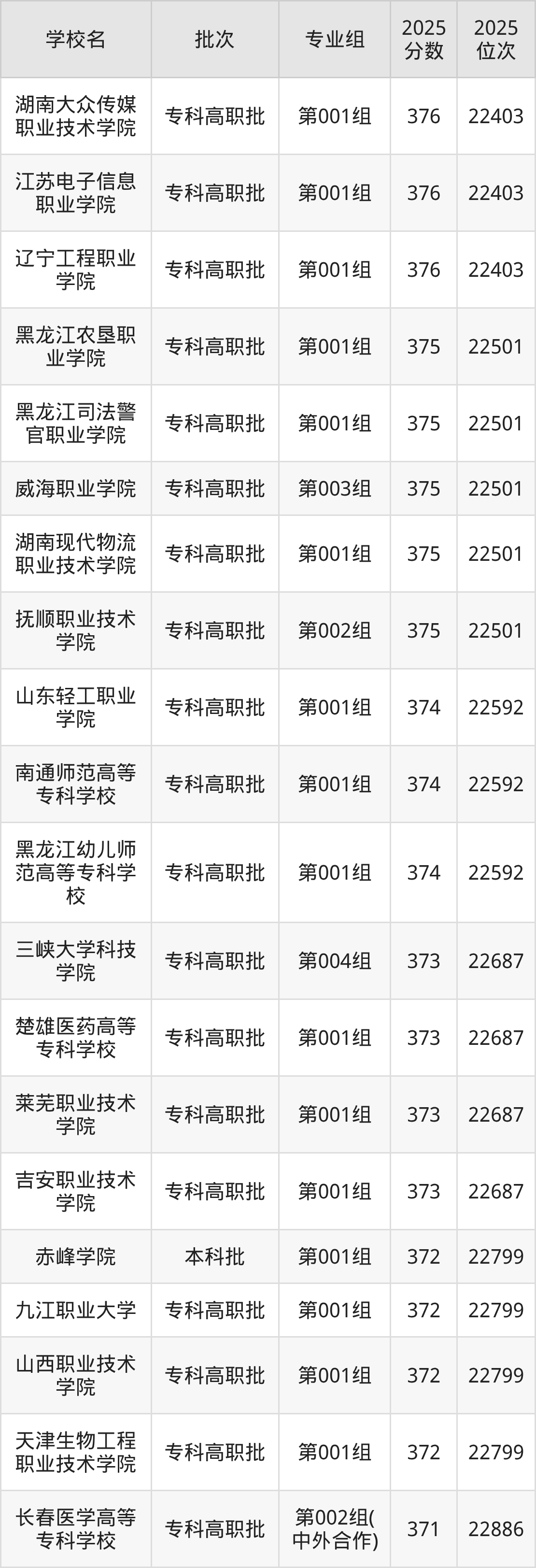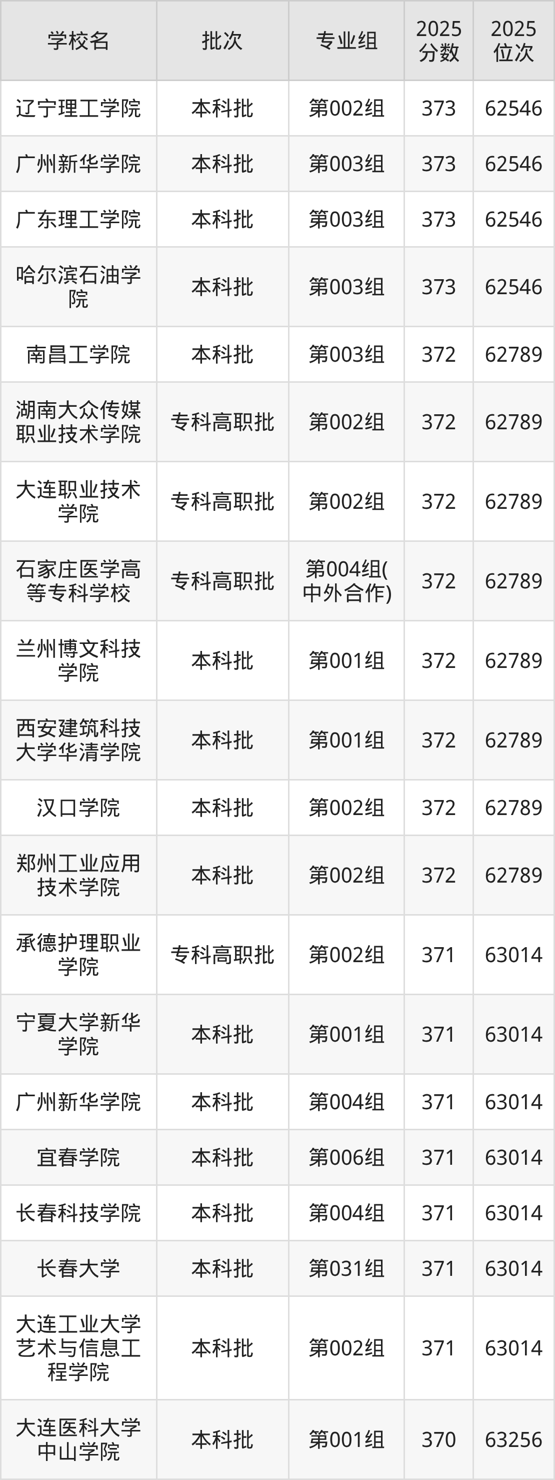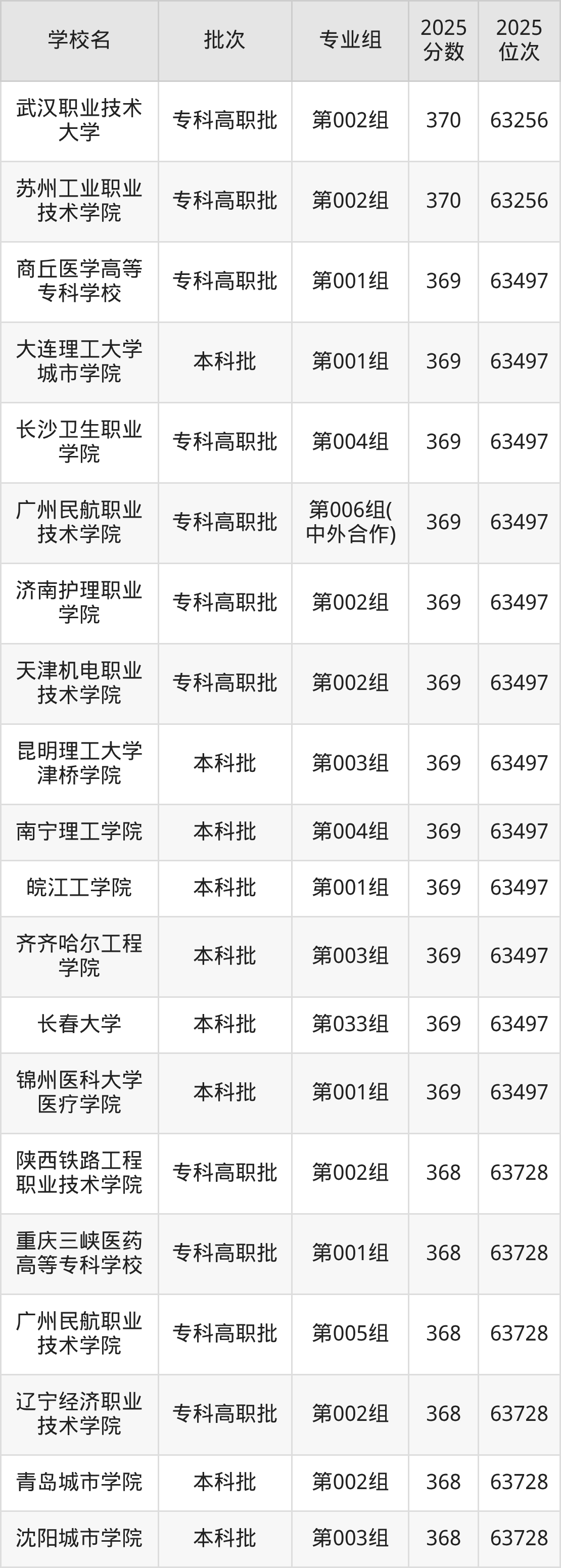 2025年吉林高考物理类370分(63015名~63256名)能上的大学有大连医科大学中山学院第001组、苏州工业职业技术学院第002组、武汉职业技术大学第002组。