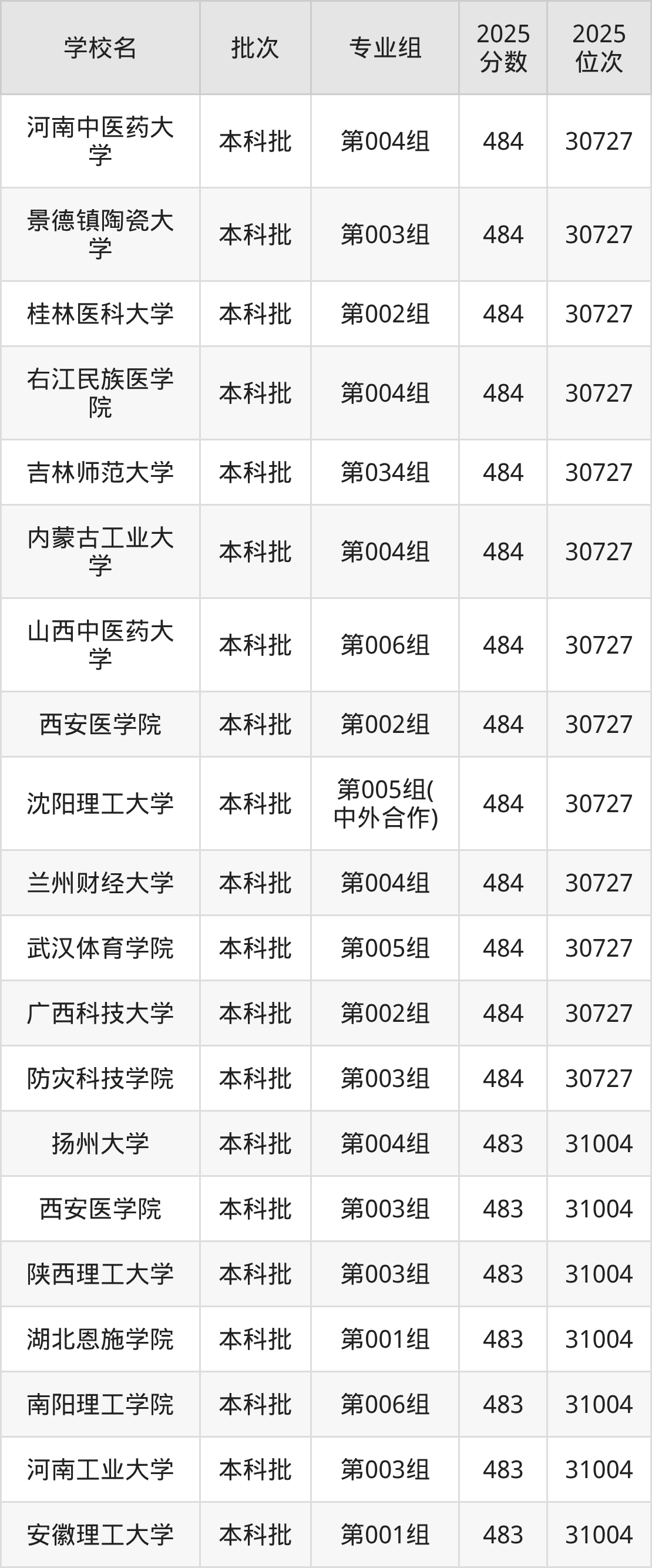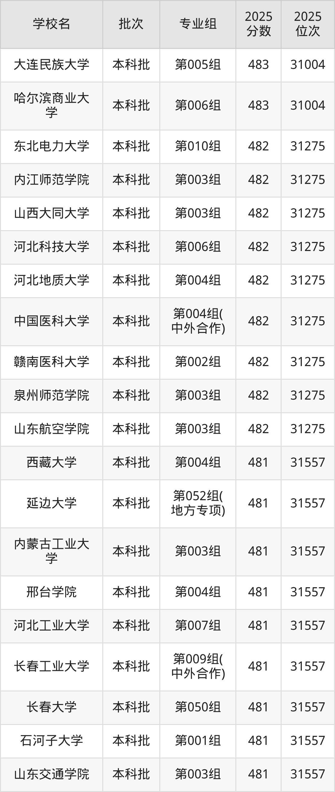 2025年吉林高考物理类482分(31005名~31275名)能上的大学有河北地质大学第004组、河北科技大学第006组、山西大同大学第003组、中国医科大学第004组(中外合作)等。