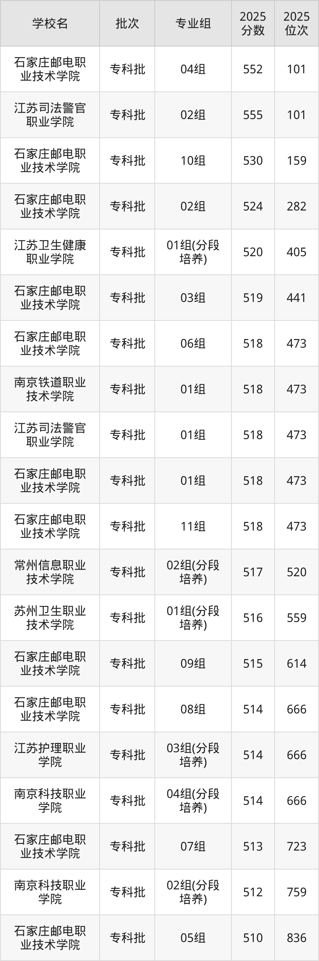 另外录取位次低于该区间(较稳妥)的有江苏司法警官职业学院04组(1195名)、石家庄邮电职业技术学院23组(1357名)等;录取位次高于该区间(可冲)的有江苏理工学院12组(133470名)、江苏理工学院21组(133470名)等。