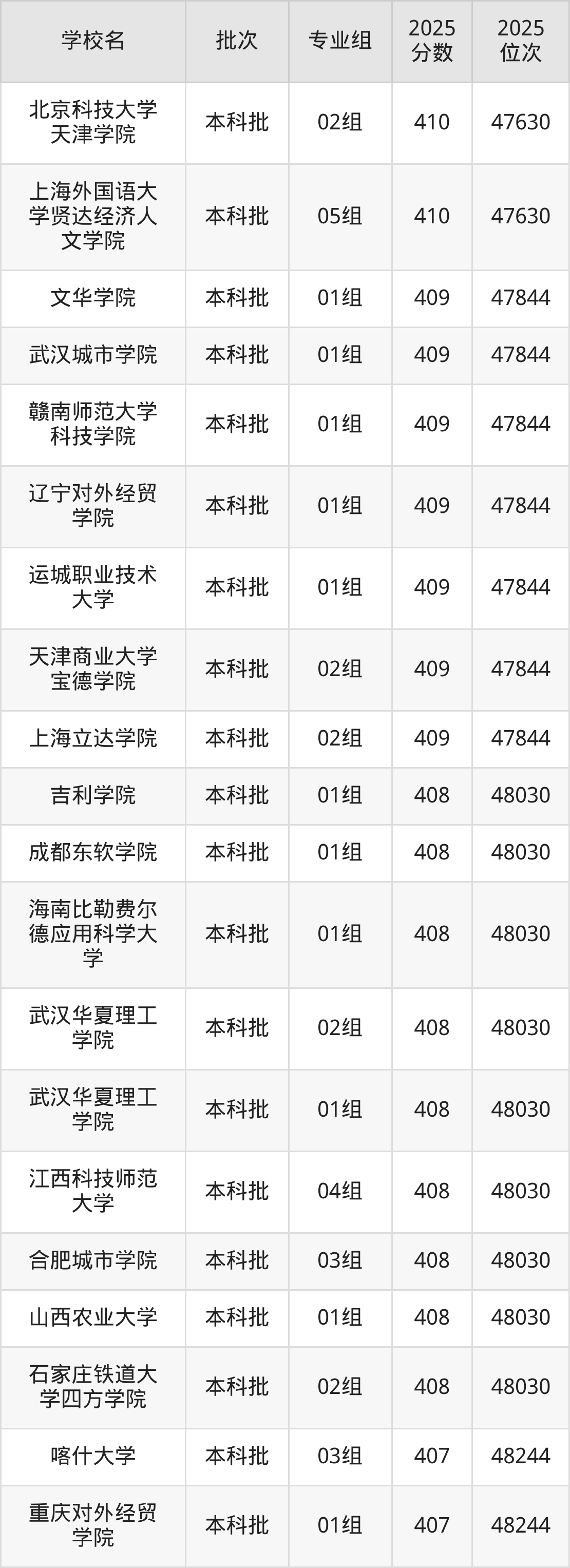 2025年上海高考409分(47631名~47844名)能上的大学有上海立达学院02组、天津商业大学宝德学院02组、运城职业技术大学01组、辽宁对外经贸学院01组等。