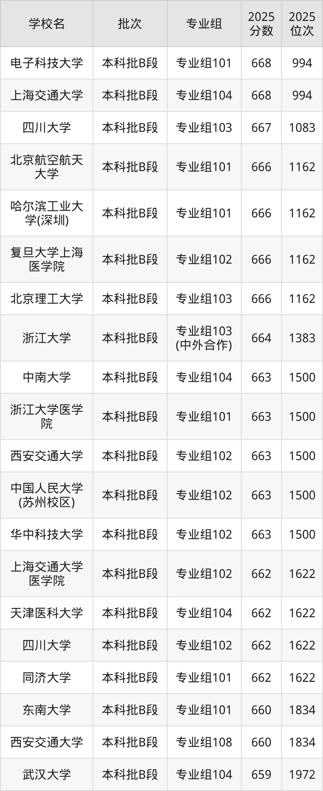 另外录取位次低于该区间(较稳妥)的有上海交通大学医学院专业组102(1622名)、天津医科大学专业组104(1622名)等;录取位次高于该区间(可冲)的有浙江大学专业组103(中外合作)(1383名)、北京航空航天大学专业组101(1162名)等。