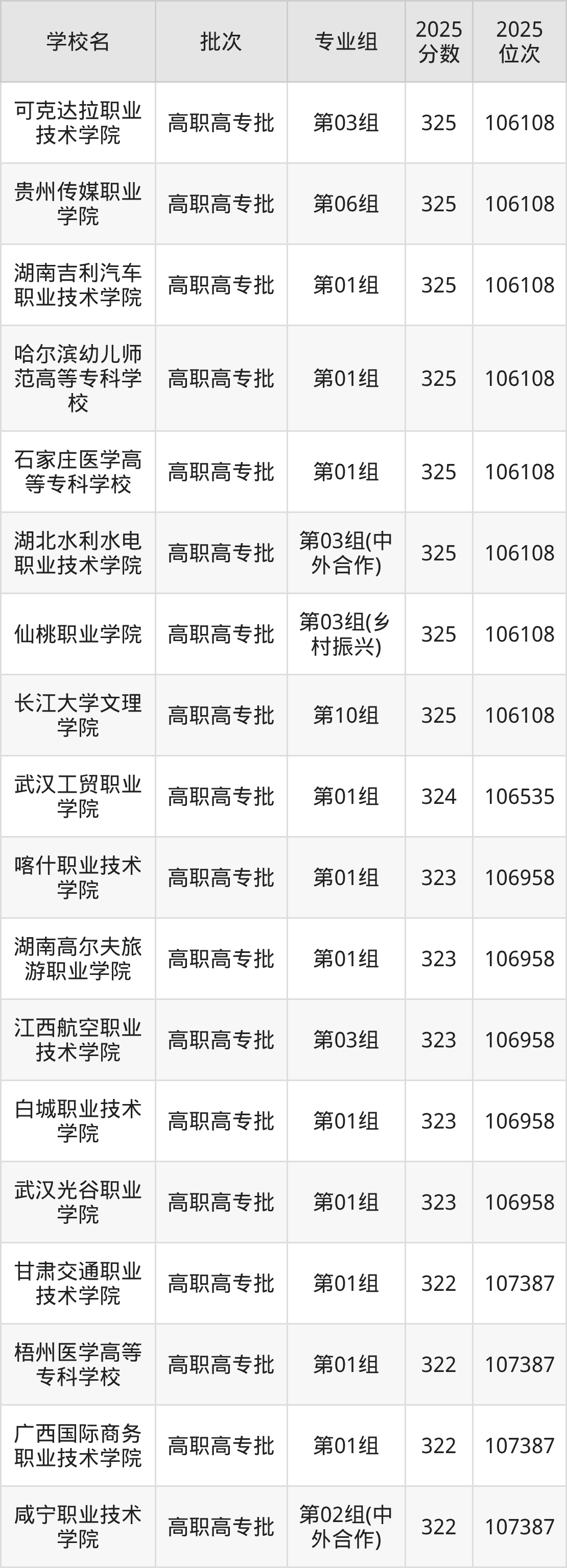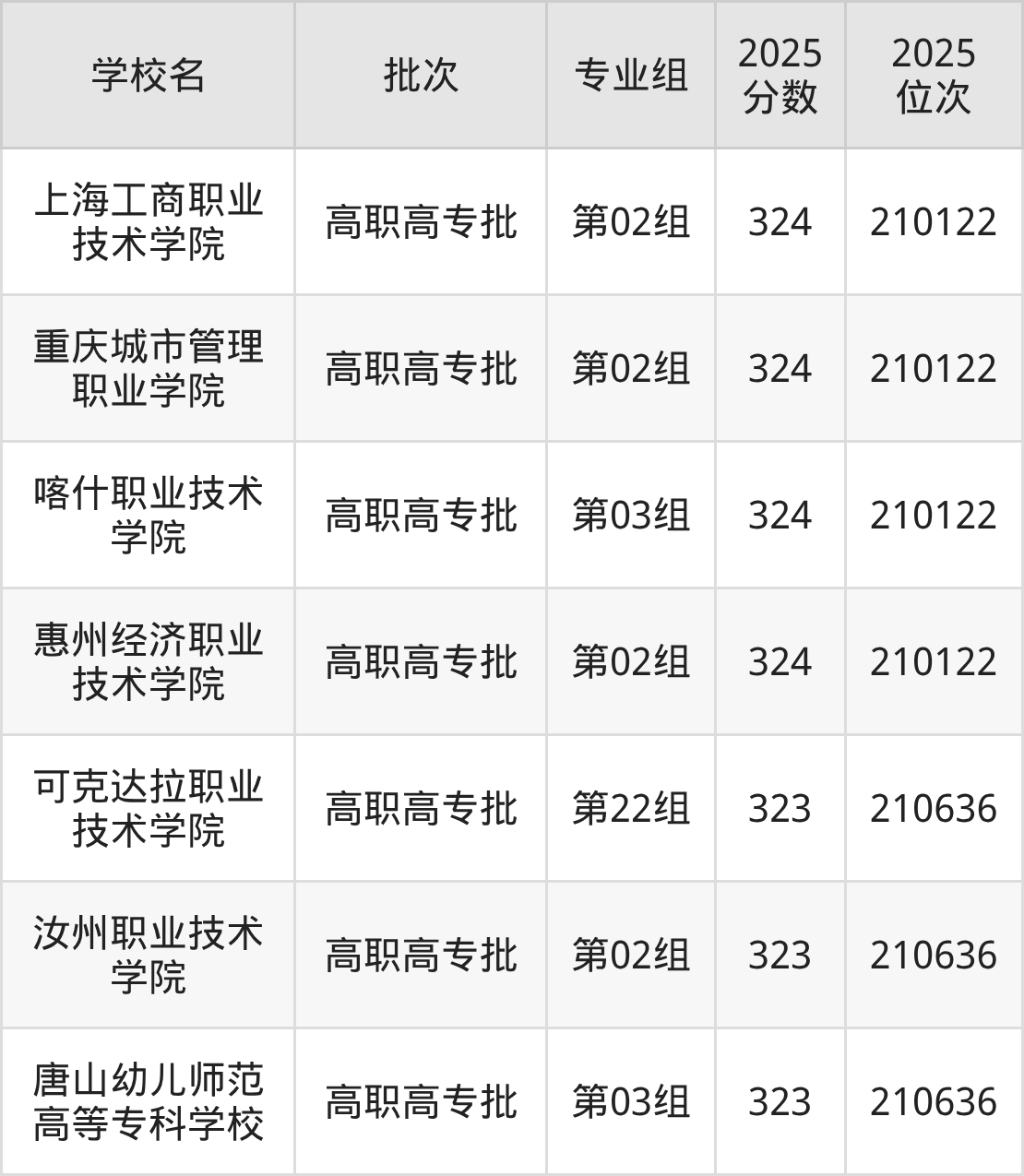2025年湖北高考物理类323分(210123名~210636名)能上的大学有唐山幼儿师范高等专科学校第03组、汝州职业技术学院第02组、可克达拉职业技术学院第22组。