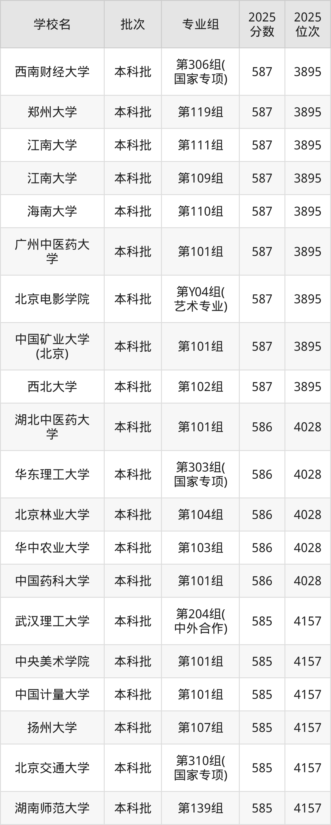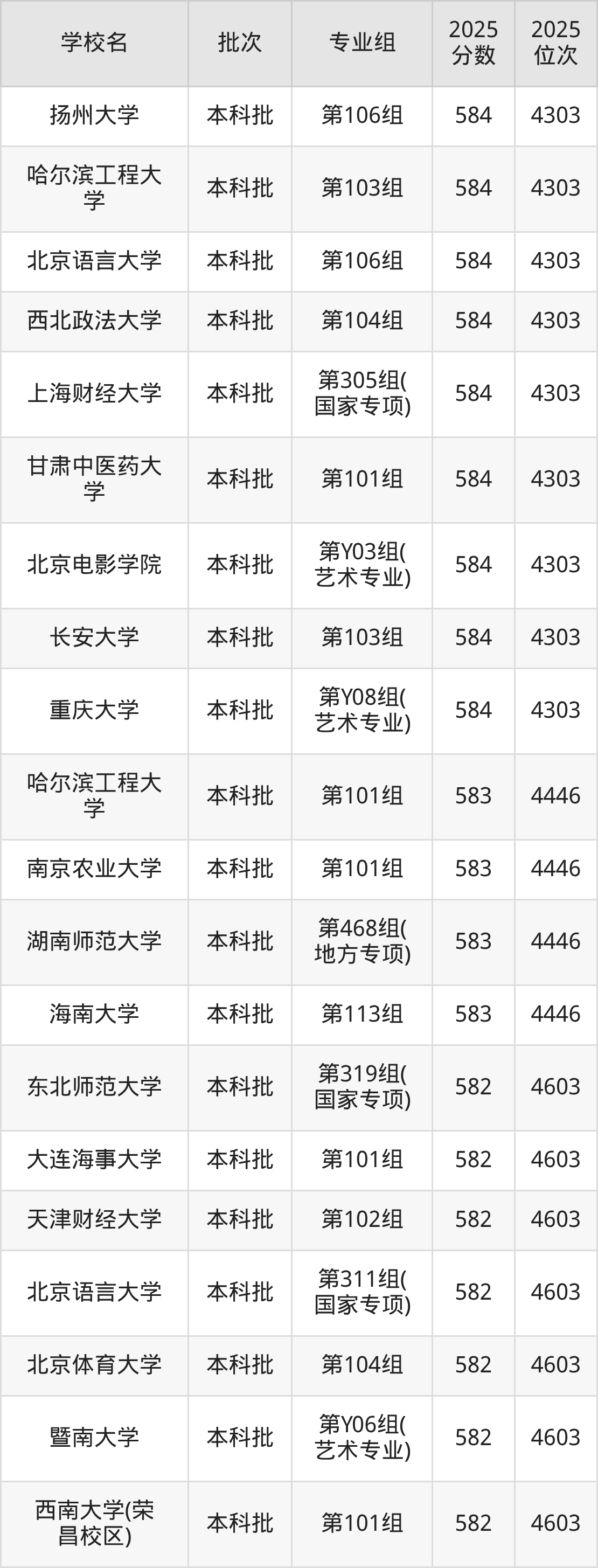 2025年湖南高考历史类583分(4304名~4446名)能上的大学有哈尔滨工程大学第101组、南京农业大学第101组、湖南师范大学第468组(地方专项)、海南大学第113组。