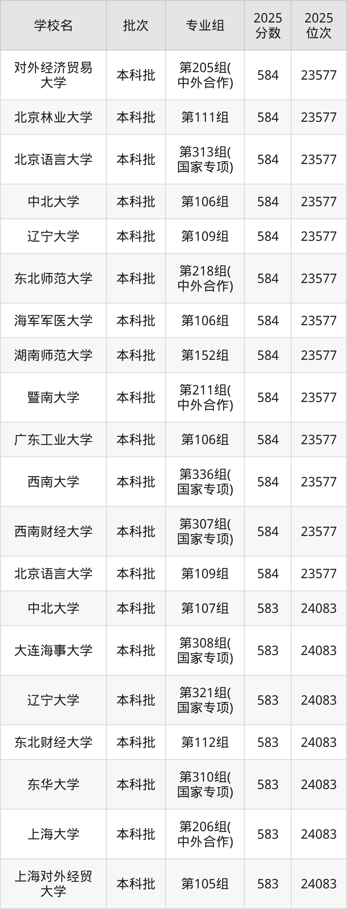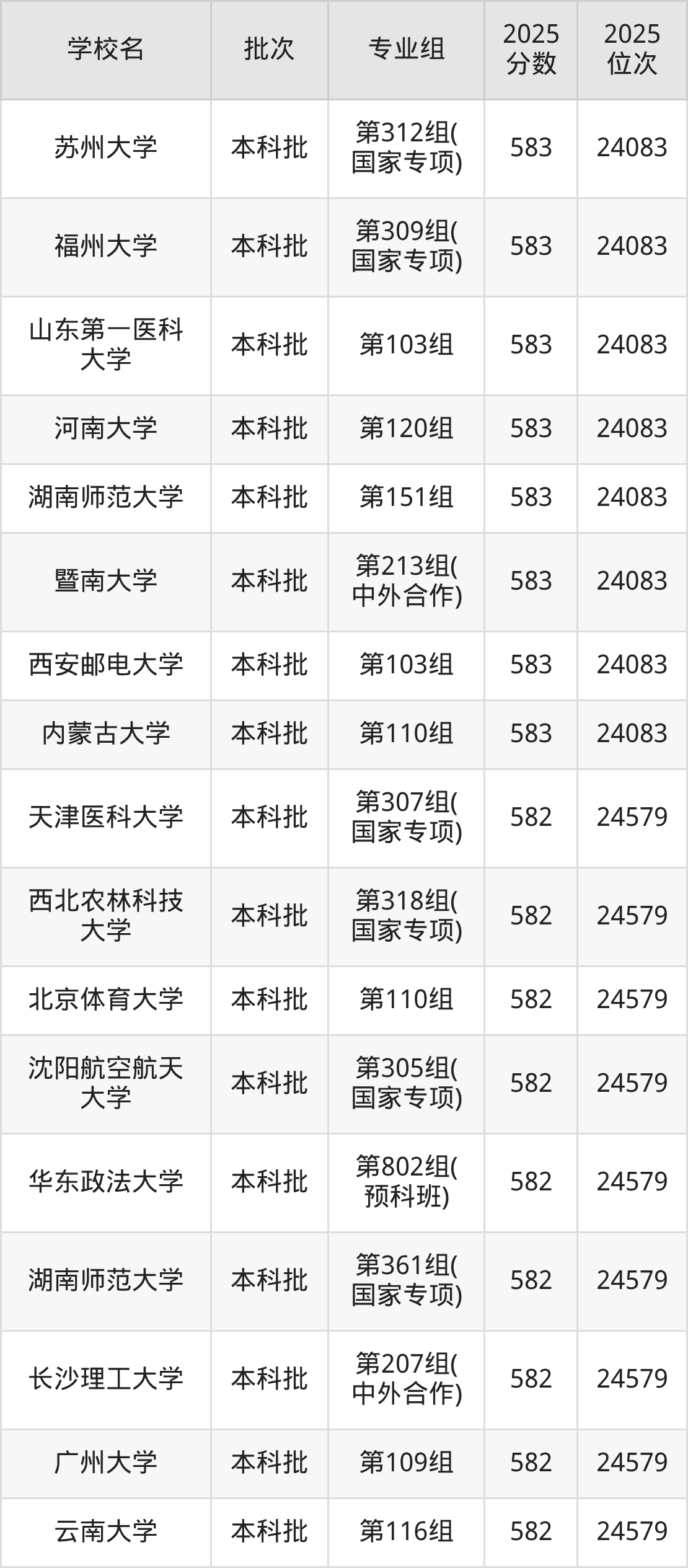 2025年湖南高考物理类583分(23578名~24083名)能上的大学有中北大学第107组、内蒙古大学第110组、大连海事大学第308组(国家专项)、辽宁大学第321组(国家专项)等。