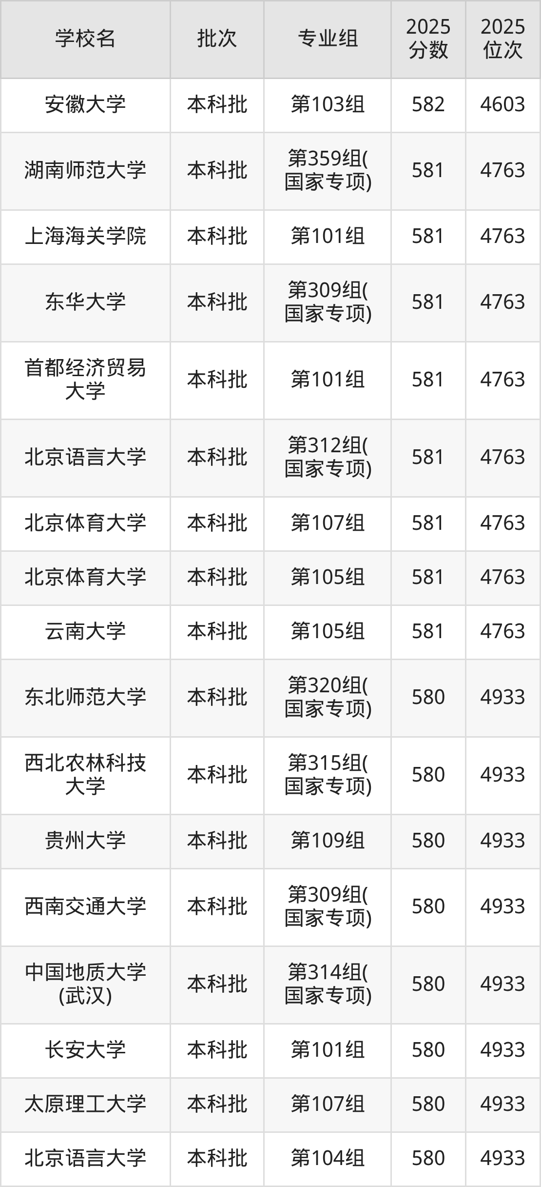 这些都是2026年高考历史类4304名~4446名考生可以报考的大学,更多学校名单如下表所示: